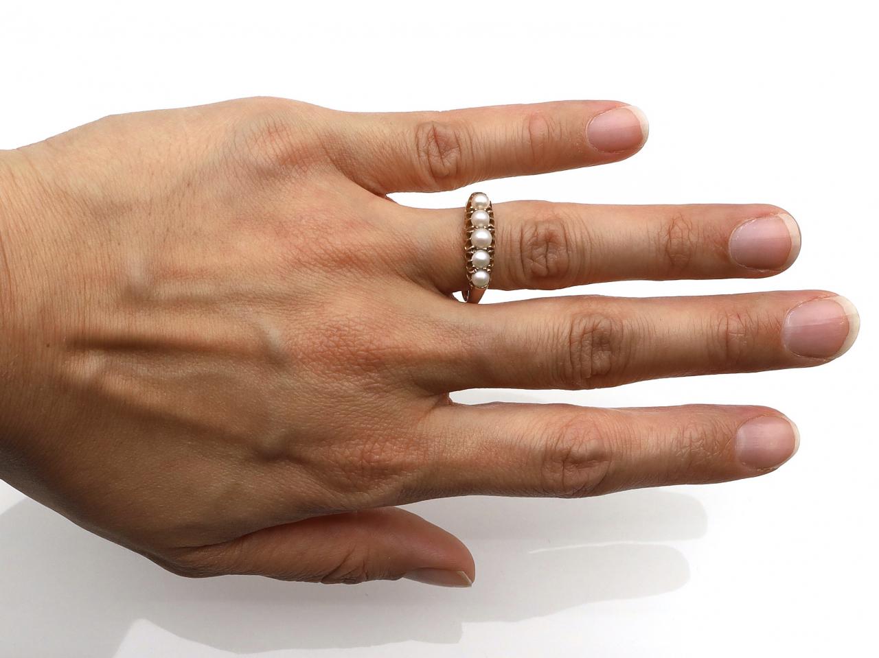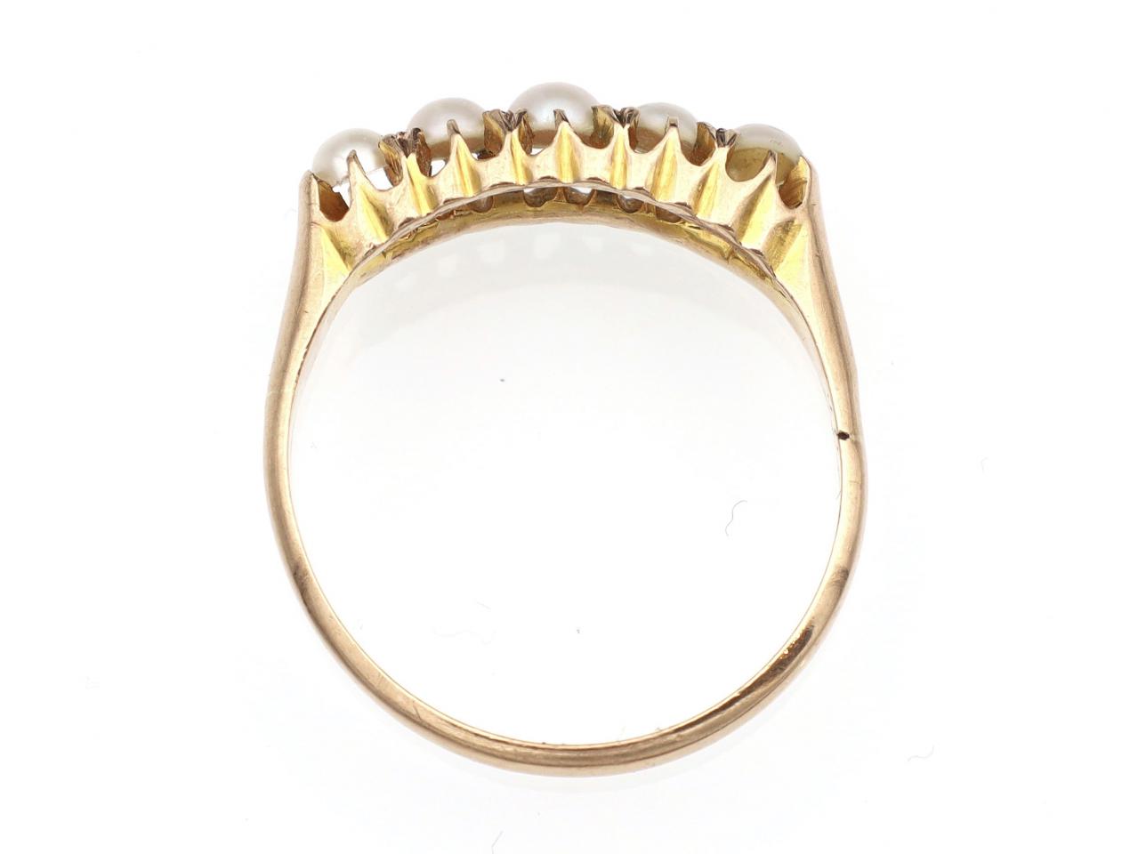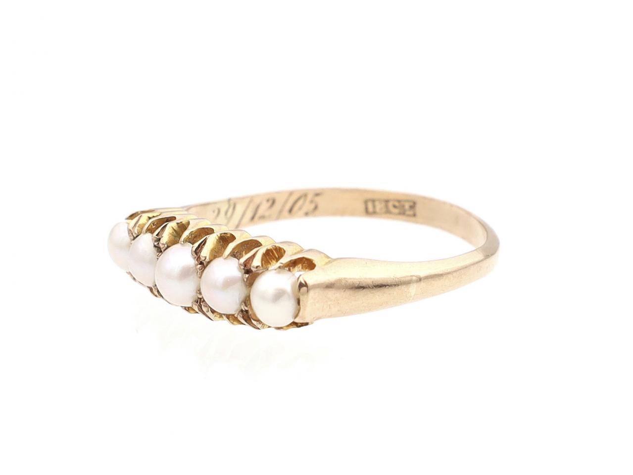 Edwardian five stone natural pearl ring in 18kt yellow gold. Horizontally set with five natural pearls in claw settings, to a delicate five stone design with open curving claws, pierced open settings and ribbed gallery, flanked to either side with trumpeting shoulders which slim to a solid shank. Engraved to the inner '22/12/1905'. Marked 18kt gold.