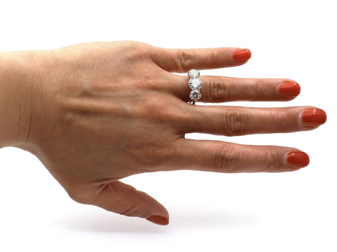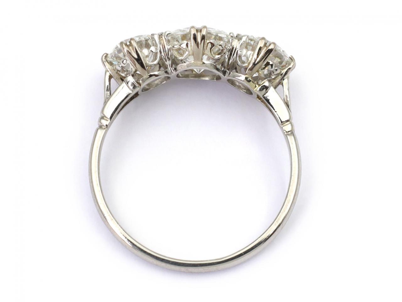 Retro graduating three stone diamond ring in platinum. Centred with a 1.52ct round brilliant cut diamond, H colour, VVS2 clarity in a fancy claw setting, flanked to either side with two round brilliant cut diamonds in fancy claw settings, to an elegant three stone design with split claws and pierced collets with decorative heart motifs, the raised tri-split shoulders join to ribbed terminals before smoothing to a solid shank. All three diamonds certified by the Service Public du Contrôle des Diamants in France certificate no.95.901, no.86.604. Total diamond weight 3.18cts.