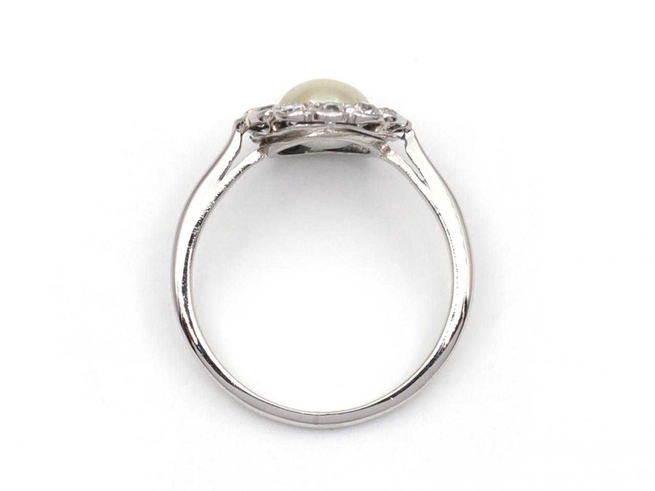 Edwardian natural pearl and diamond floral cluster ring in platinum. Centred with a natural pearl in a grain setting, surrounded by a singular row of round old cut diamonds in grain settings, to a circular cluster design with scalloped edges, finely pierced gallery and raised inwardly tapering shoulders which smooth to a solid shank.