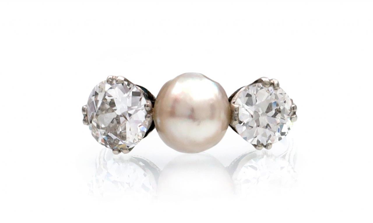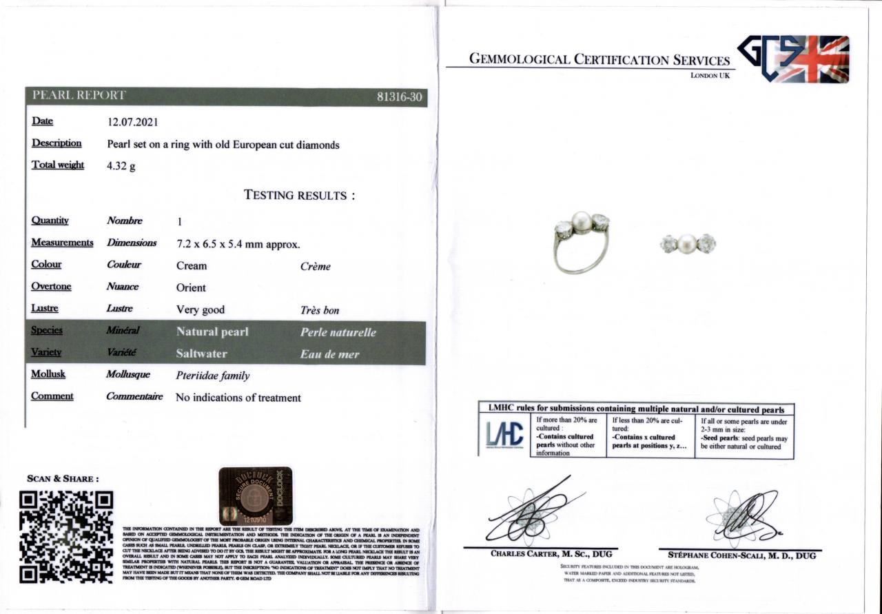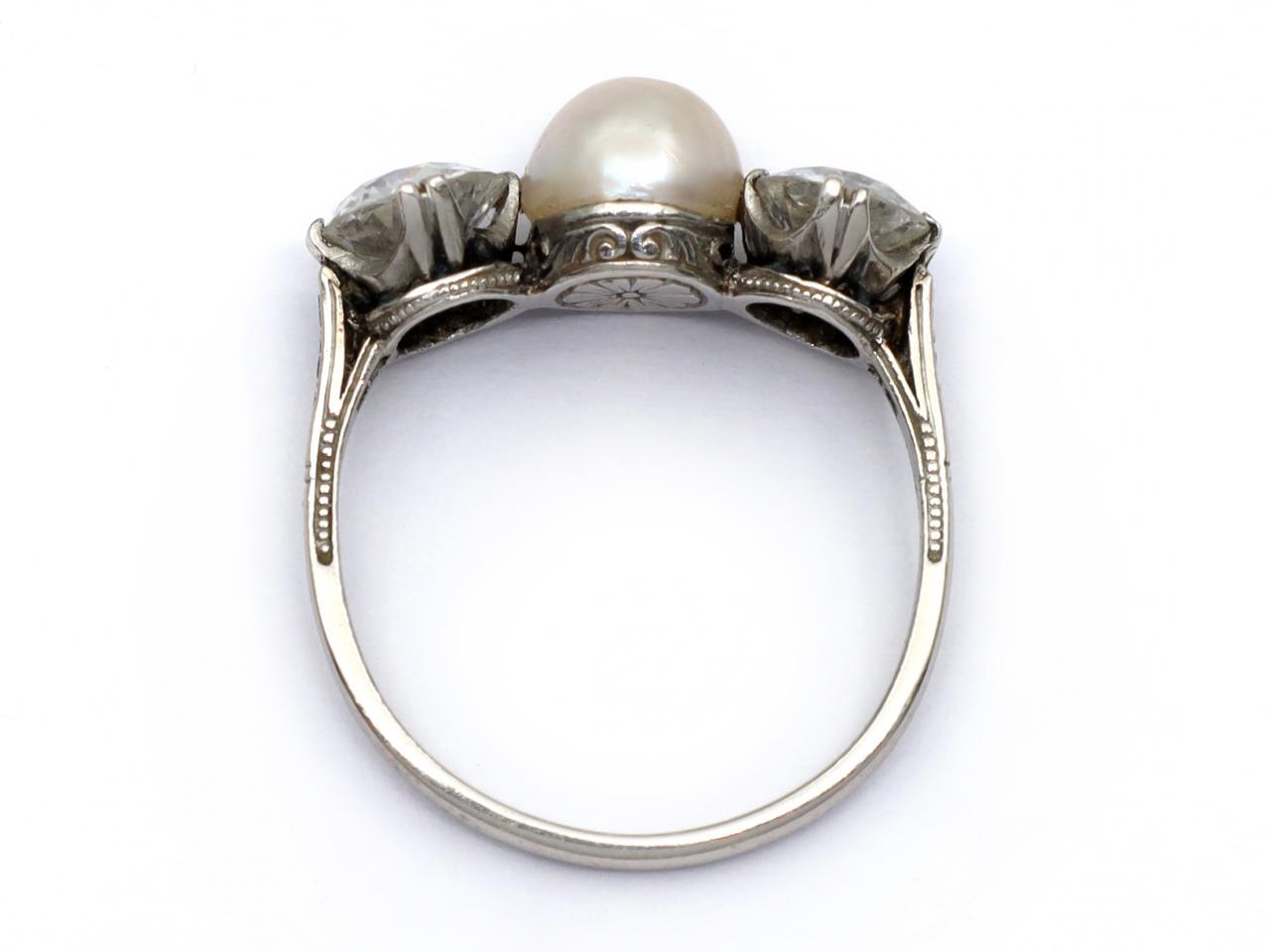 Edwardian natural pearl and diamond three stone ring in platinum. Centred with a natural saltwater pearl flanked to either side with two round Old European cut diamonds in split claw settings, to a three stone design with curving claws, engraved gallery and subtle granulation, the raised trumpeting shoulders are studded with eight cut diamonds in grain settings before terminating to a slim shank. Estimated total diamond weight 1.75cts. Accompanied by Gemmological Certification Services certificate.