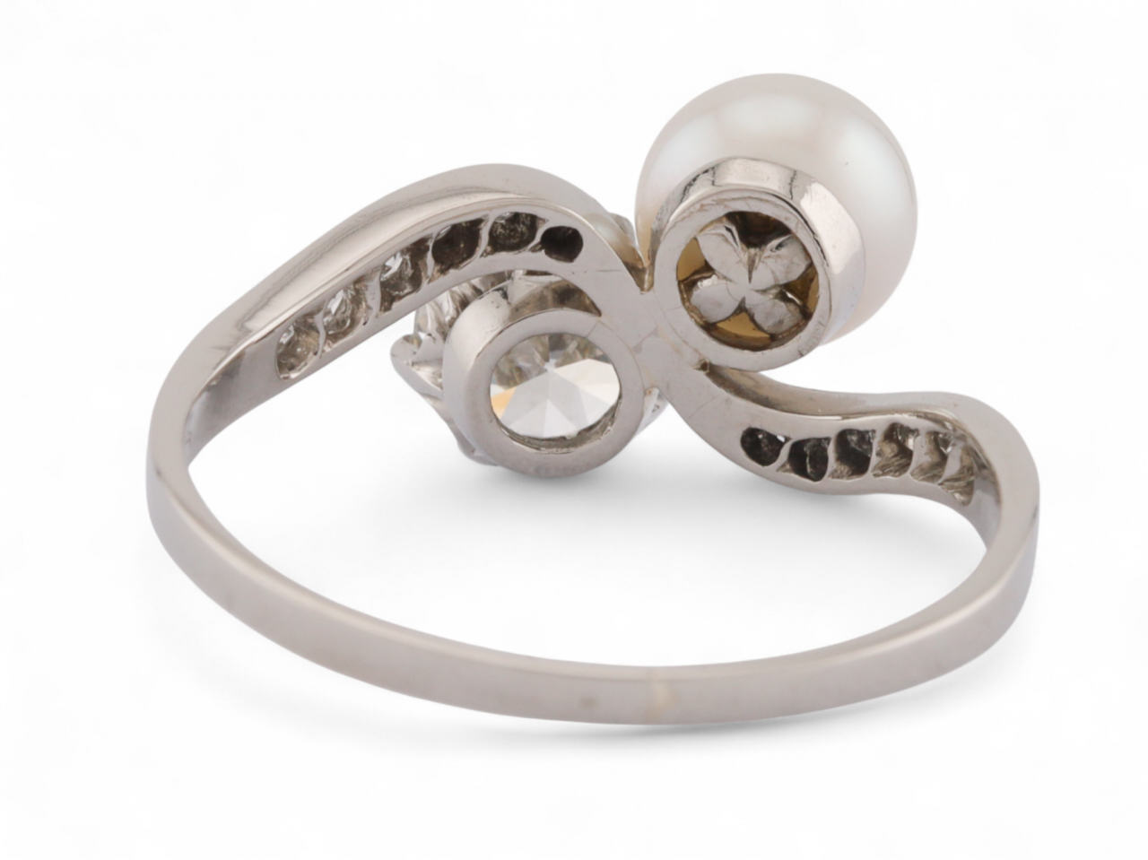 An Edwardian period 'toi et moi' ring in platinum. Designed as a bypass ring, set diagonally with a button shape natural saltwater pearl measuring approximately 6.2mm in diameter and 5.0–5.5mm in depth, opposite an Old European cut diamond, estimated to weigh 0.95 carats, assessed as H–I colour and VS2–SI1 clarity. The principal stones are mounted in raised settings, the diamond in a six-claw platinum coronet setting. Each shoulder is grain set with a row of eight small single cut diamonds in millegrain borders, forming a curved design that joins to a solid platinum shank