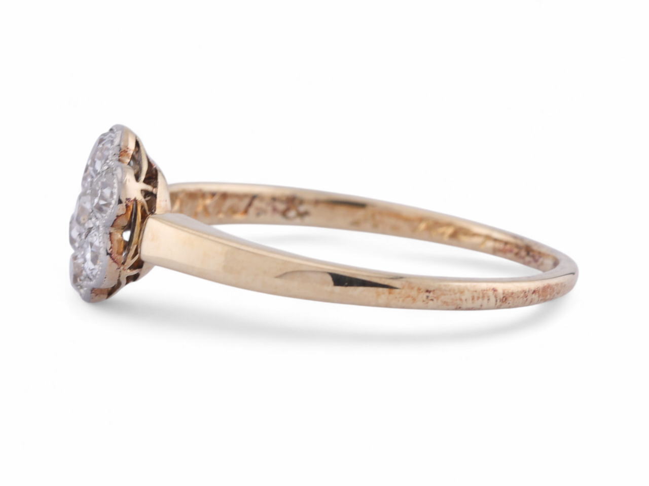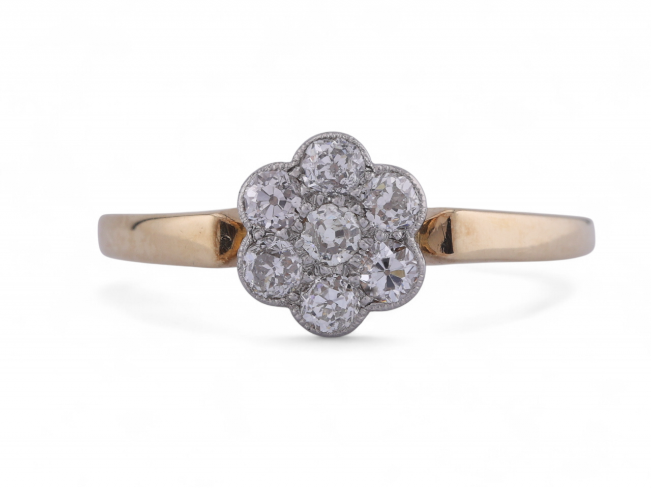 Edwardian old mine cut diamond daisy cluster ring in 18kt yellow gold and platinum