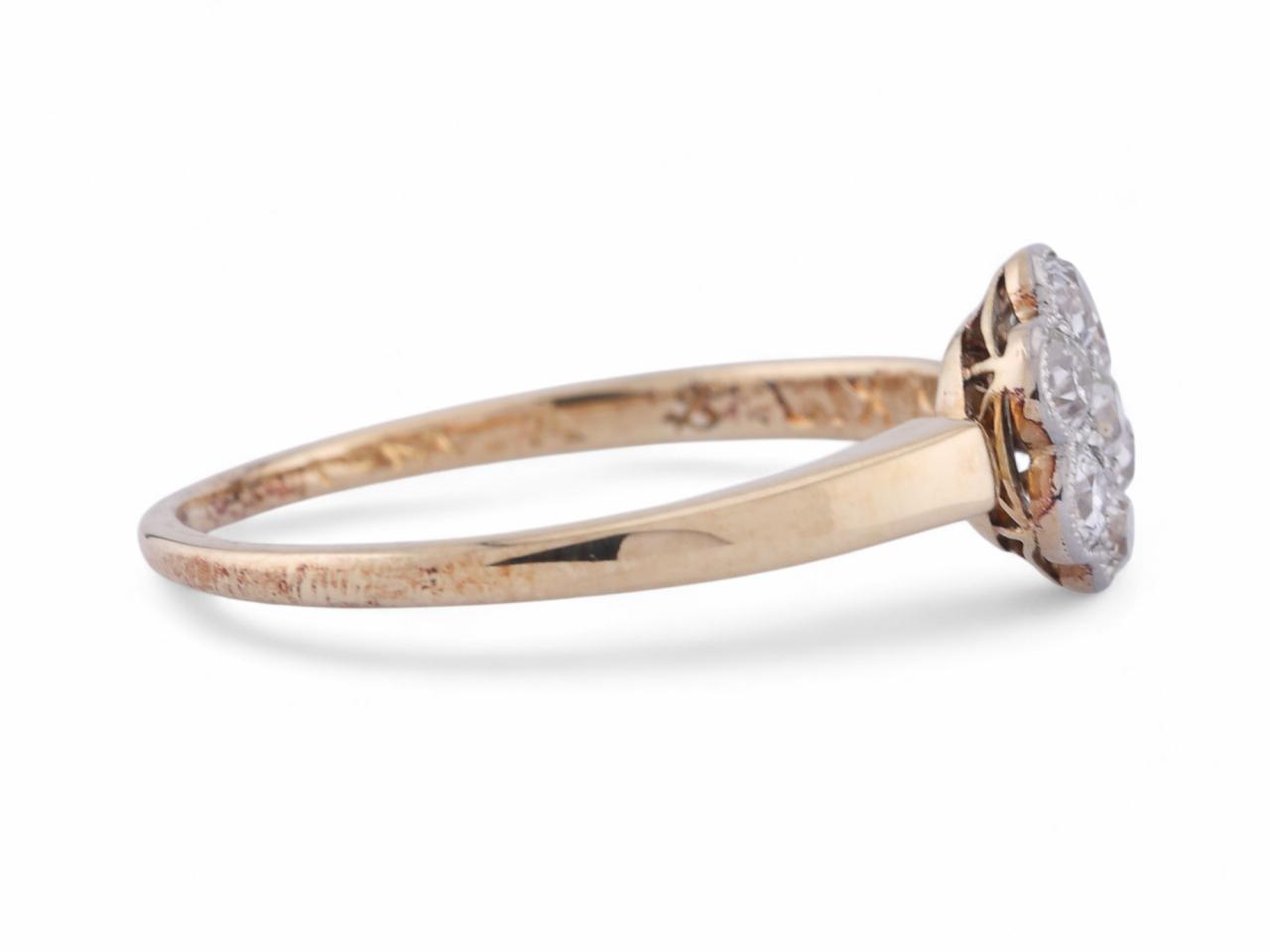 Set to the centre with a single old mine cut diamond in a raised claw setting, surrounded by six smaller old mine cut diamonds forming a classic daisy-style cluster. The platinum-topped head features a scalloped edge and pierced gallery, leading to slim shoulders and a plain D-section shank. Total estimated diamond weight 0.34cts, assessed as G–J colour and SI clarity. Edwardian period. Tested 18kt yellow gold and platinum.