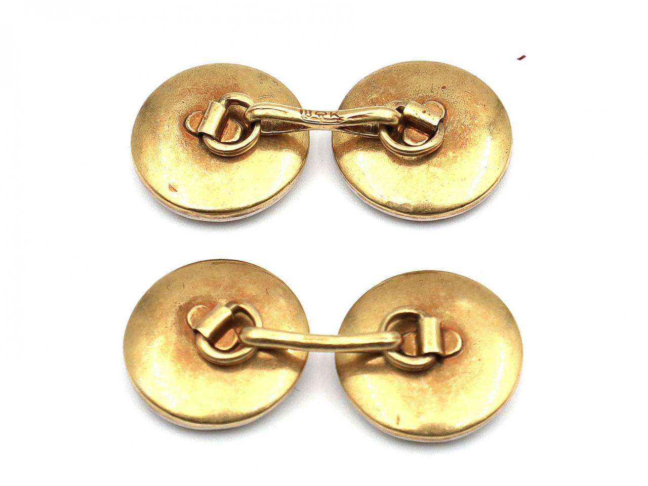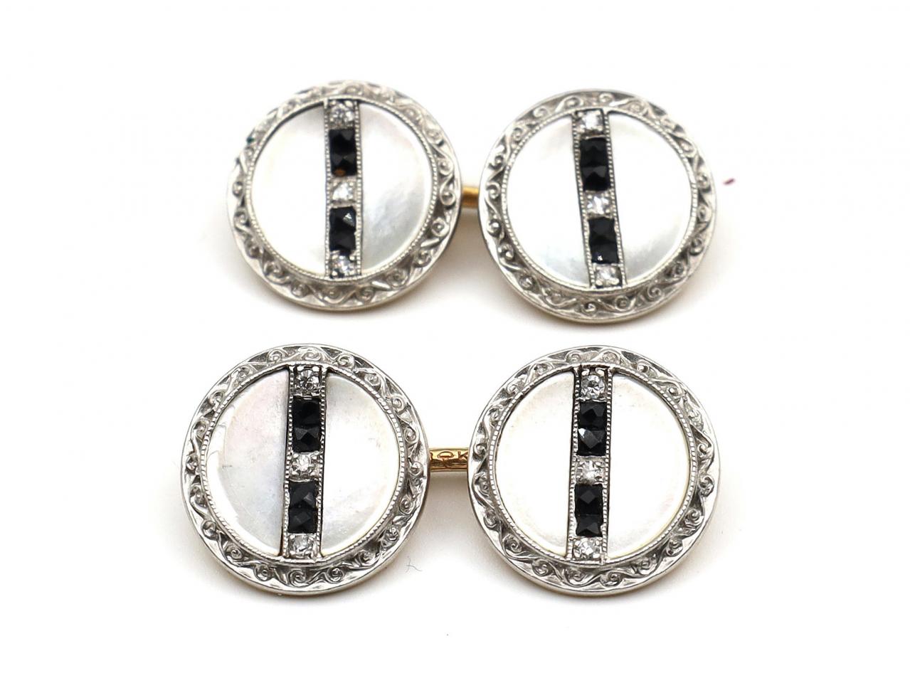 Edwardian onyx, diamond and mother of pearl button cufflinks in 18kt yellow gold.