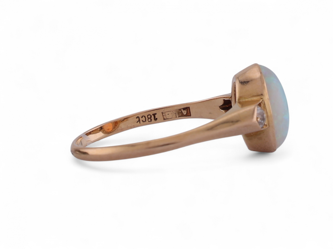 Antique three stone ring set with an oval cabochon opal displaying subtle play-of-colour, secured in a rub-over setting, flanked to each side by a single old European cut diamond in a recessed collet setting. The plain polished shoulders lead to a slender D-shaped shank. Stamped and tested as 18kt rose gold.