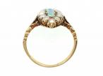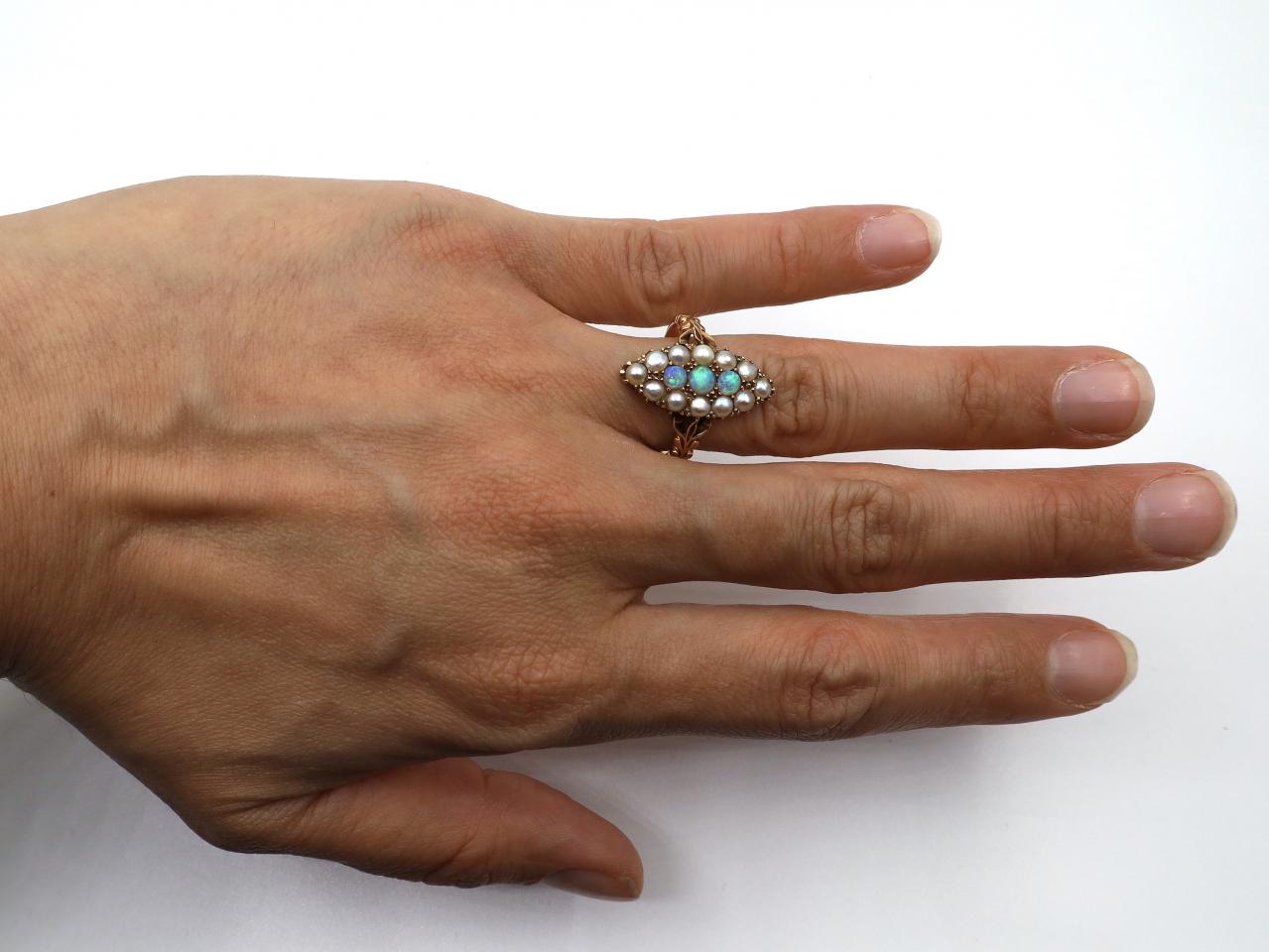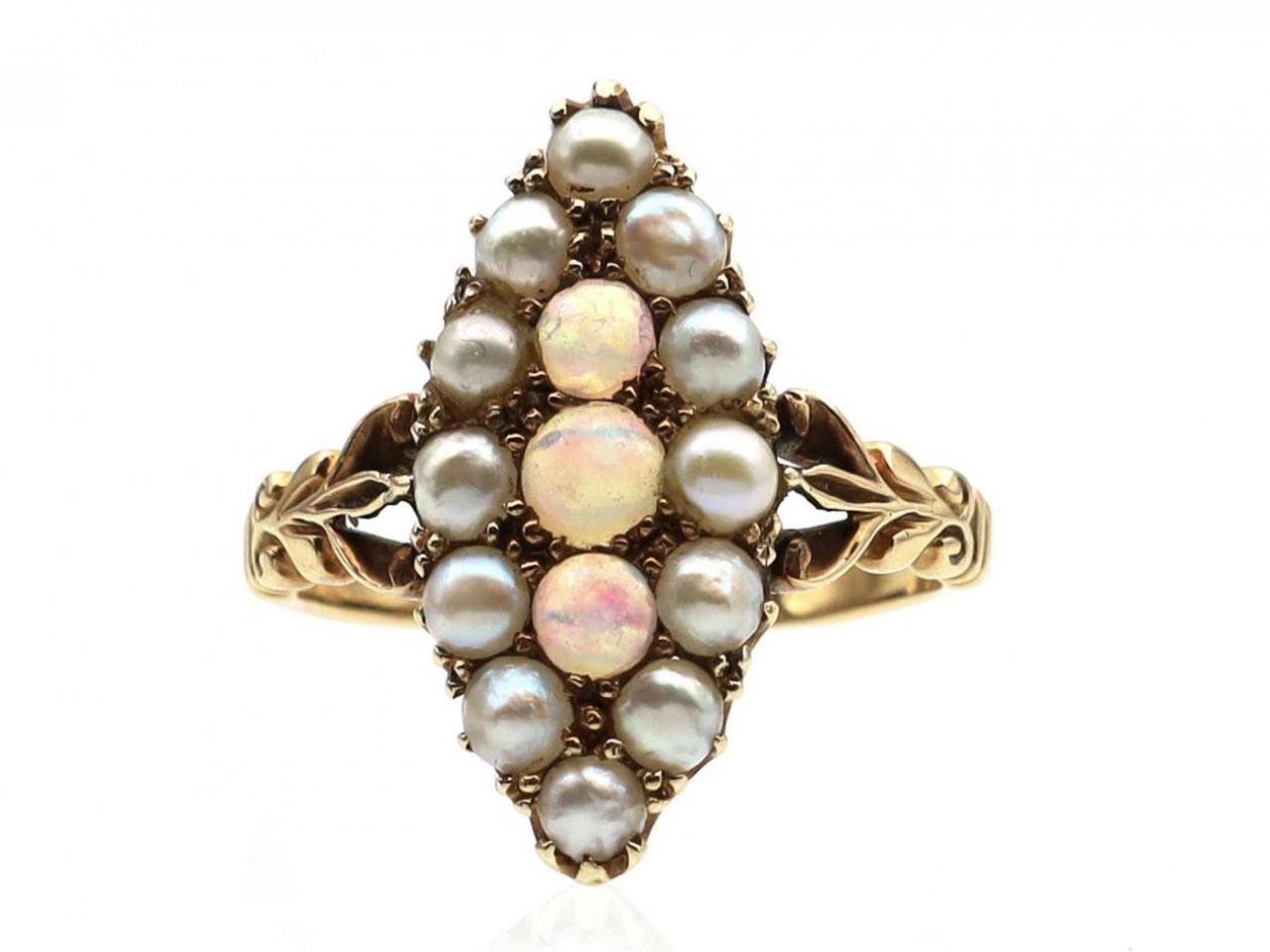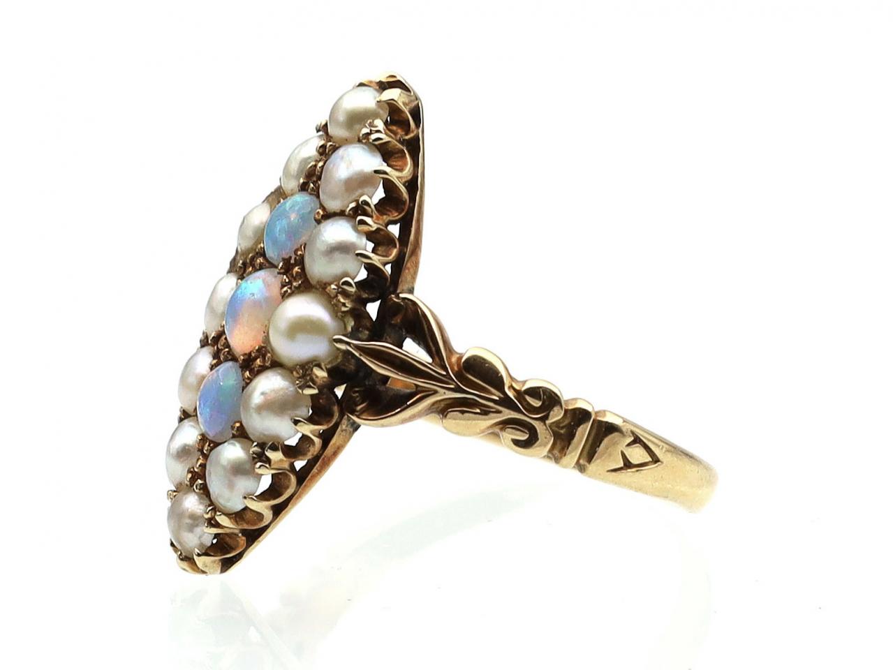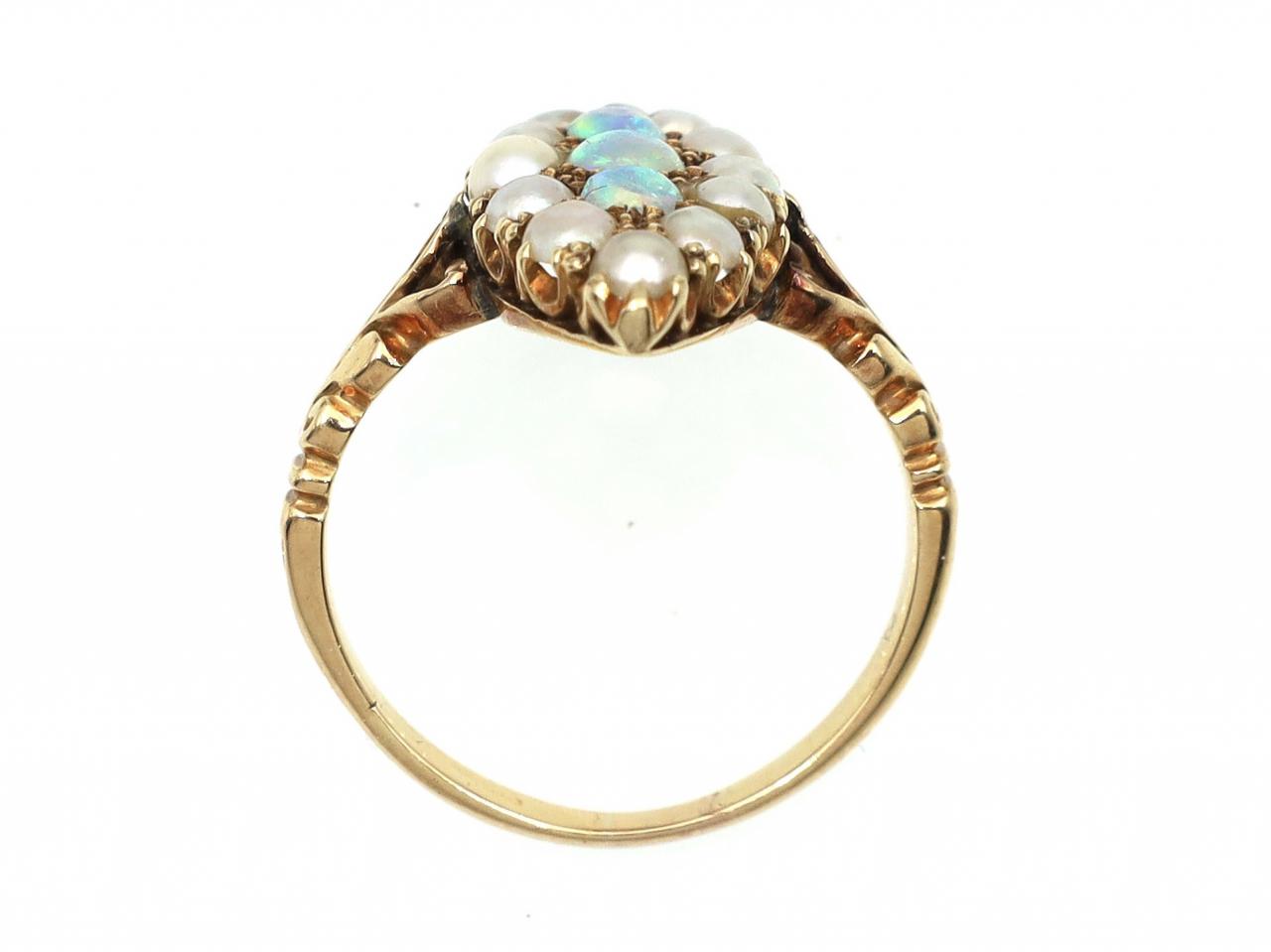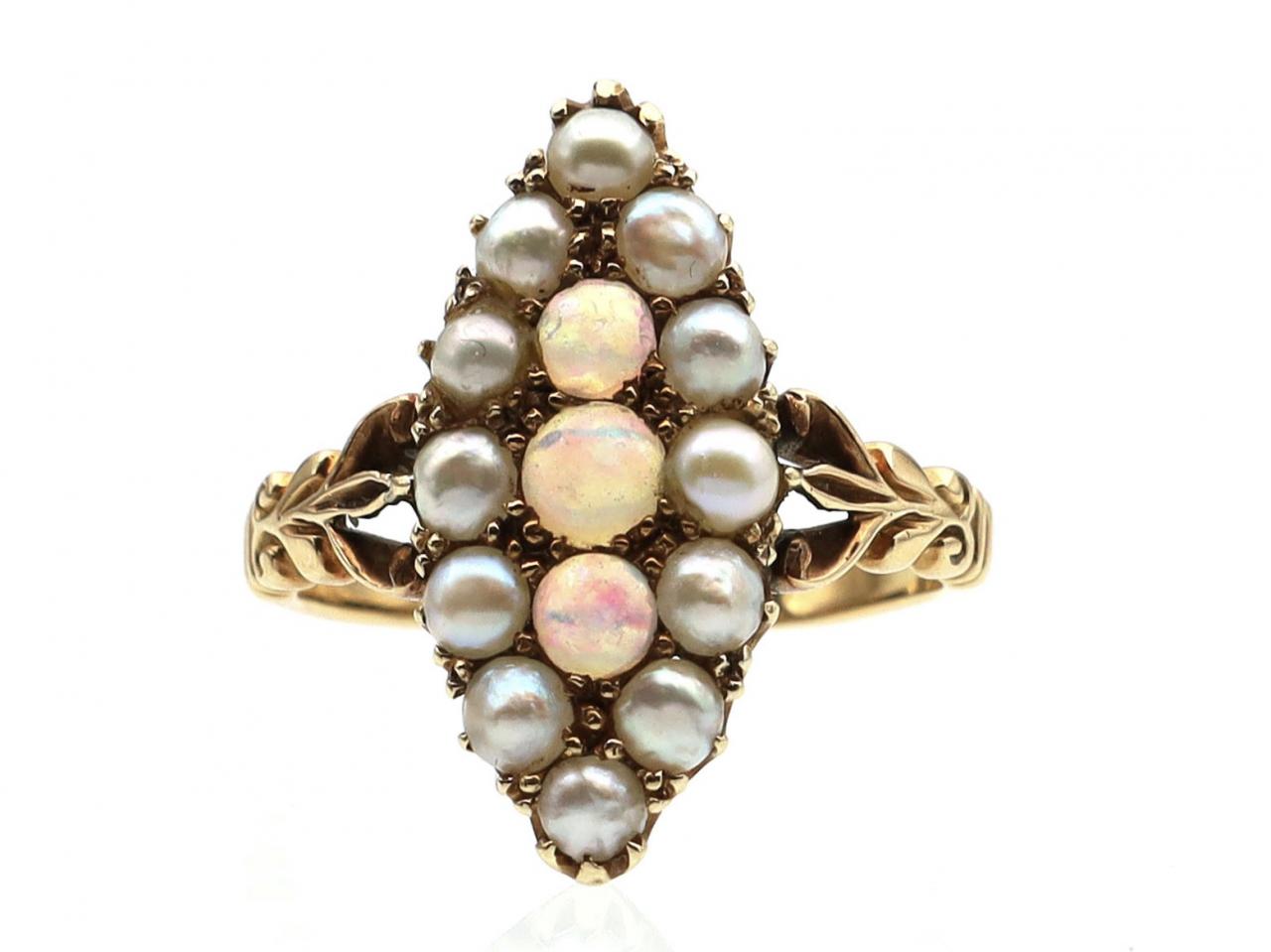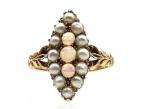 Edwardian opal and seed pearl marquise cluster ring in gold. Vertically set with three round cabochon opals in grain settings, surrounded by a frame of seed pearls in grain and claw settings, flanked by tri-split shoulders with carved details terminating to a slim shank.