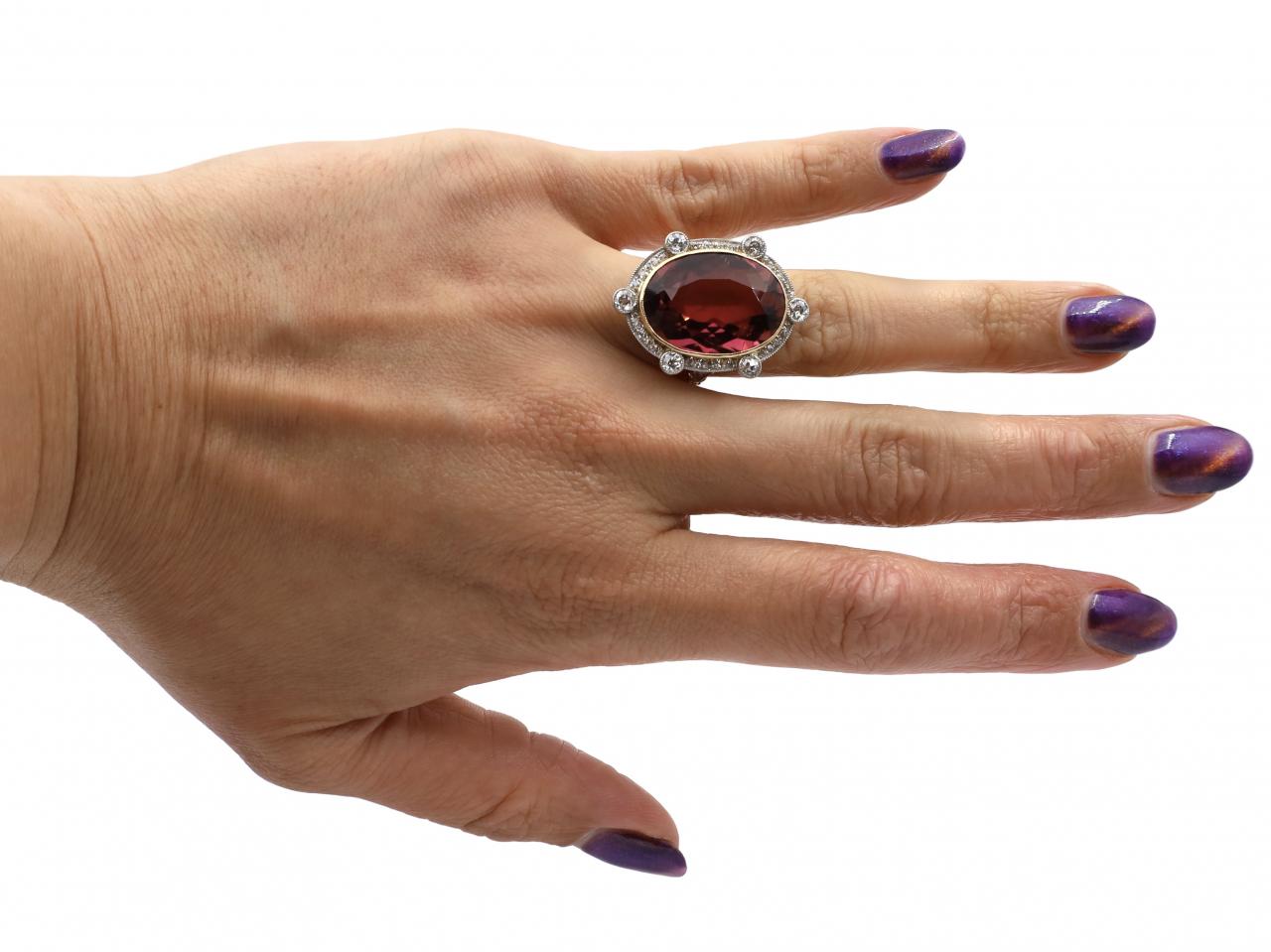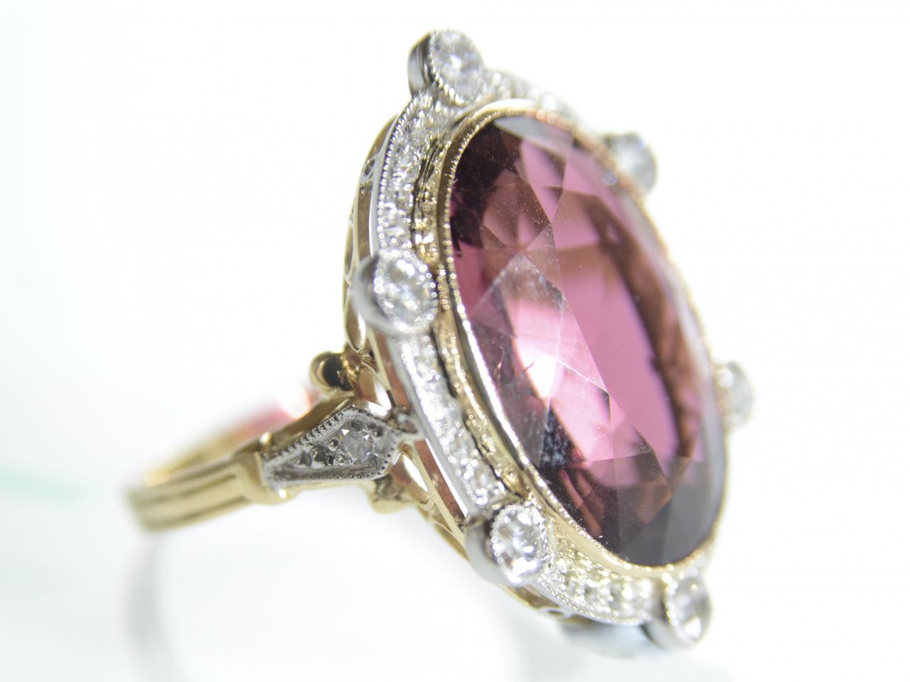 Edwardian reddish purple tourmaline and diamond cluster ring in platinum and 18kt yellow gold. Centrally set with an oval reddish purple tourmaline in a millegrain setting, encircled by a row of round eight cut diamonds in grain settings, with six raised round Old European cut diamonds in millegrain settings, to an impressive fancy oval cluster supported by cheniers and intricate openwork gallery, flanked by raised inwardly tapering shoulders with diamond set accents, terminating to a ribbed shank.
