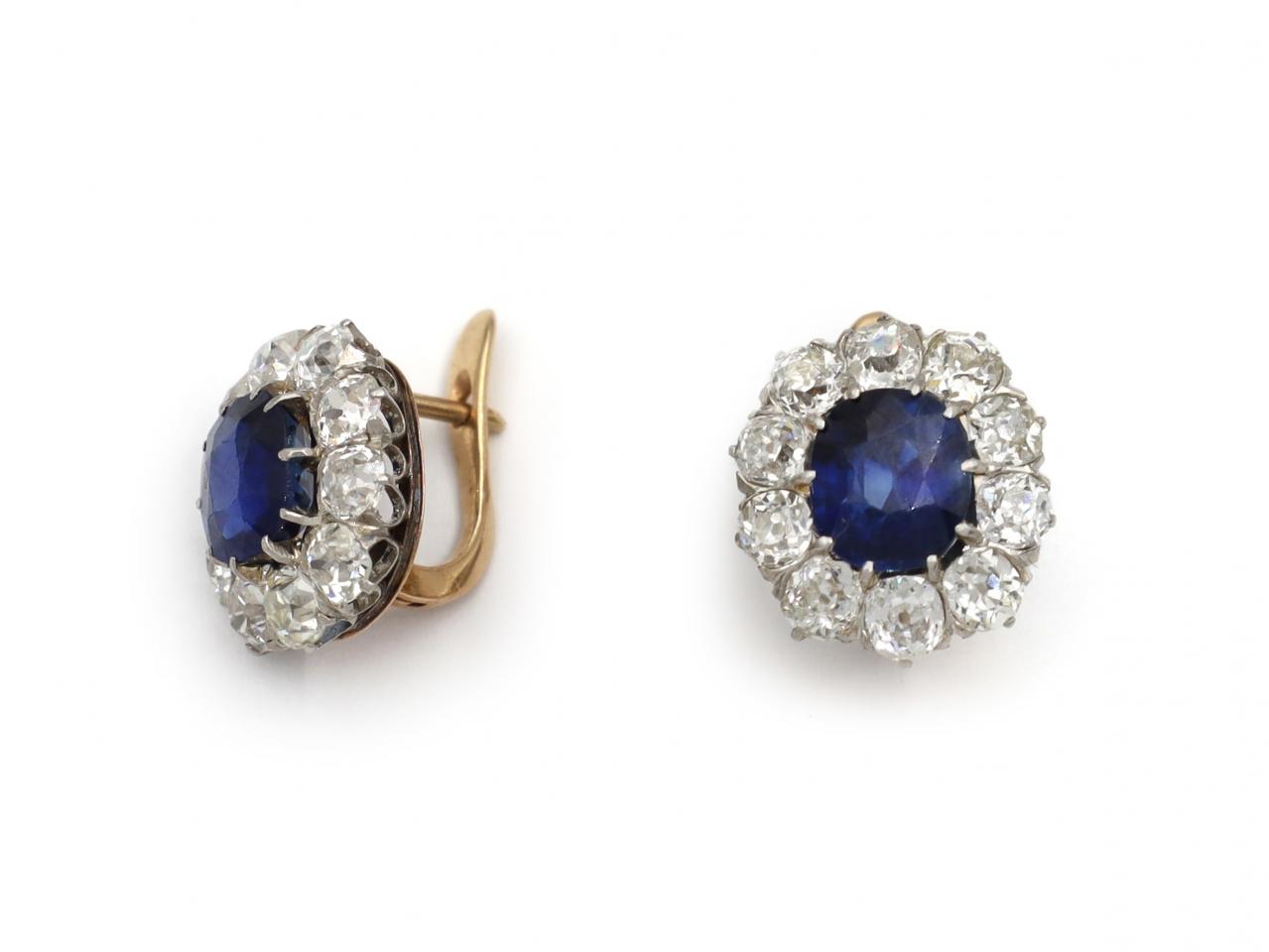Edwardian sapphire and diamond coronet cluster earrings in platinum on 18kt gold. A matching pair of earrings, each centred with an oval mixed cut sapphire in a slightly raised platinum claw setting, encircled by a row of cushion shape Old Mine cut diamonds in platinum claw and grain settings, to an elegant circular cluster design with fine claws, pierced gallery and fitted to the reverse with a secure post and butterfly fitting.