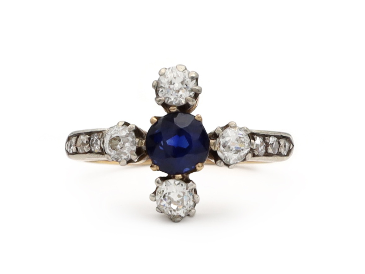Edwardian sapphire and diamond cruciform cluster in 18kt yellow gold. Centred with a round mixed cut sapphire in a claw setting, set to the cross sections with four cushion shape Old European cut diamonds in claw settings, to a stylish cluster design featuring raised curving claws, pierced collets and met to either side with six old cut diamonds in grain settings which terminate to a solid shank.