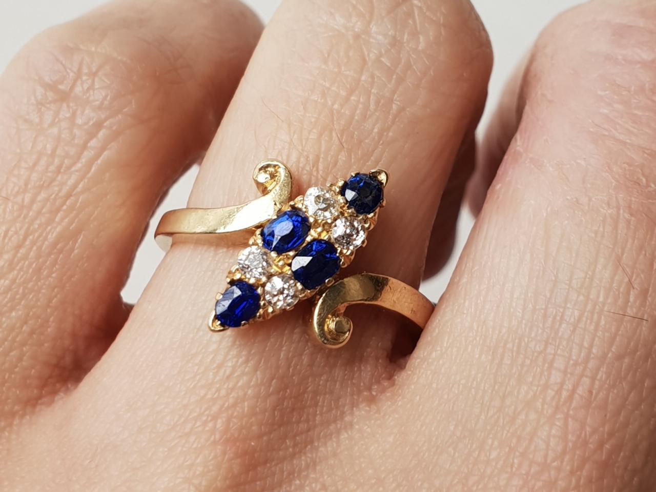 Edwardian sapphire and diamond diagonal navette cluster ring in 18kt yellow gold. Set with four elongated cushion shape mixed cut sapphires in grain and claw settings, alternating with four round old cut diamonds in grain and claw settings, to a marquise cluster, fitted to an angle with fine curving claws, pierced gallery and met to either side with scrolling shoulders which sweep to a solid shank. Hallmarked 18kt gold, Chester, 1904.