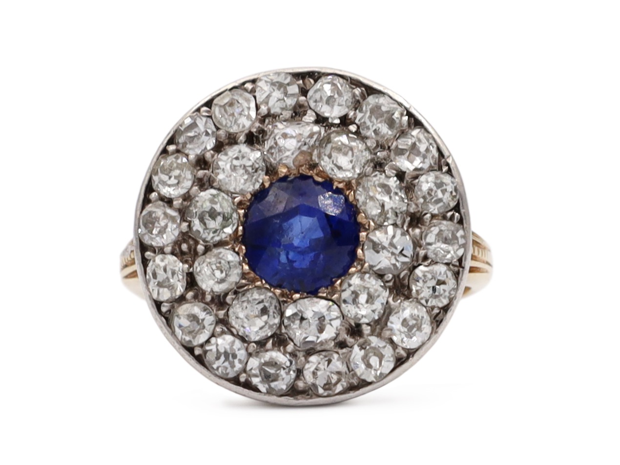 Edwardian sapphire and diamond double row circular cluster ring in platinum and 18kt yellow gold. Set with round mixed cut sapphire in a yellow gold grain setting, surrounded by two rows of cushion shape Old Mine cut diamonds in platinum grain settings, to a circular cluster with polished border, pierced scalloped gallery and met to either side with trumpeting shoulders featuring intricately carved patterns which smooth to a solid shank.