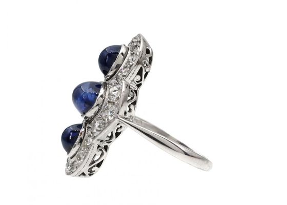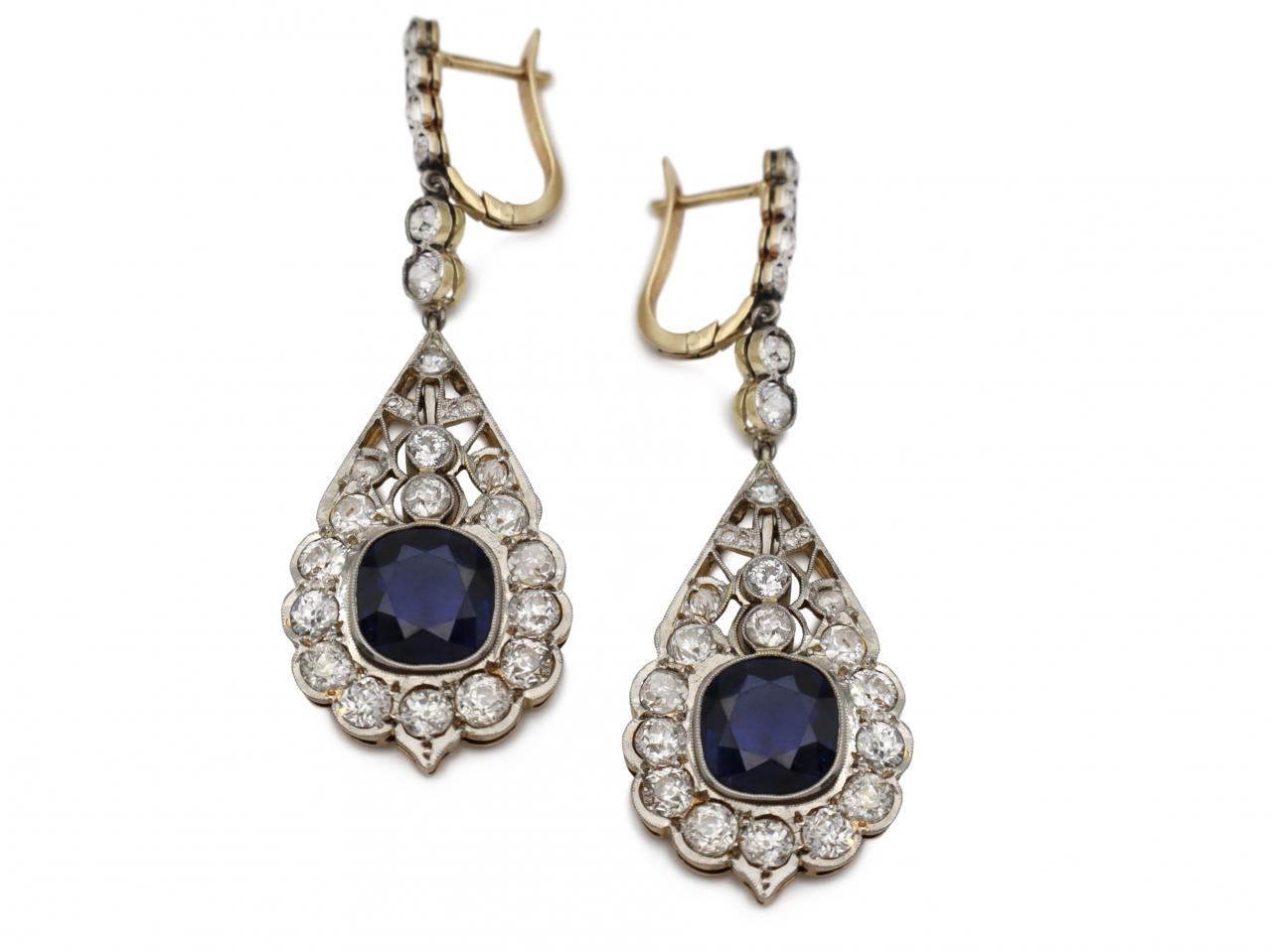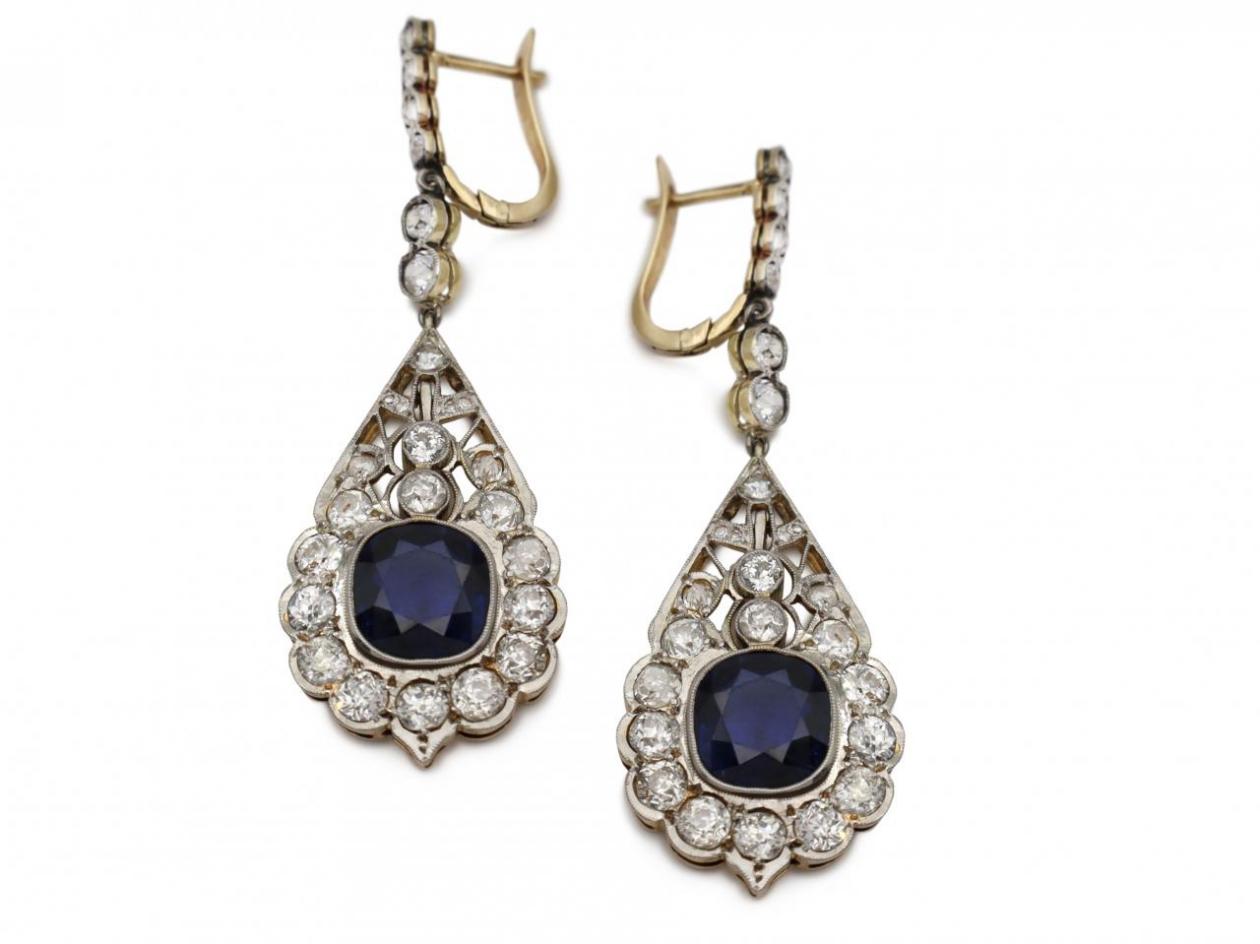 Edwardian sapphire and diamond pendant earrings in platinum and gold. A matching pair of earrings, each set with a cushion shape mixed cut sapphire in a platinum millegrain setting, surrounded by twenty six cushion shape old cut diamonds in grain and millegrain settings, to an elegant drop earring, flowing with articulation, decorated with pierced openwork, all suspended from a secure post and hinged backing.