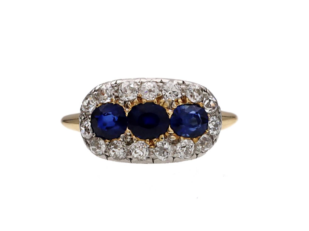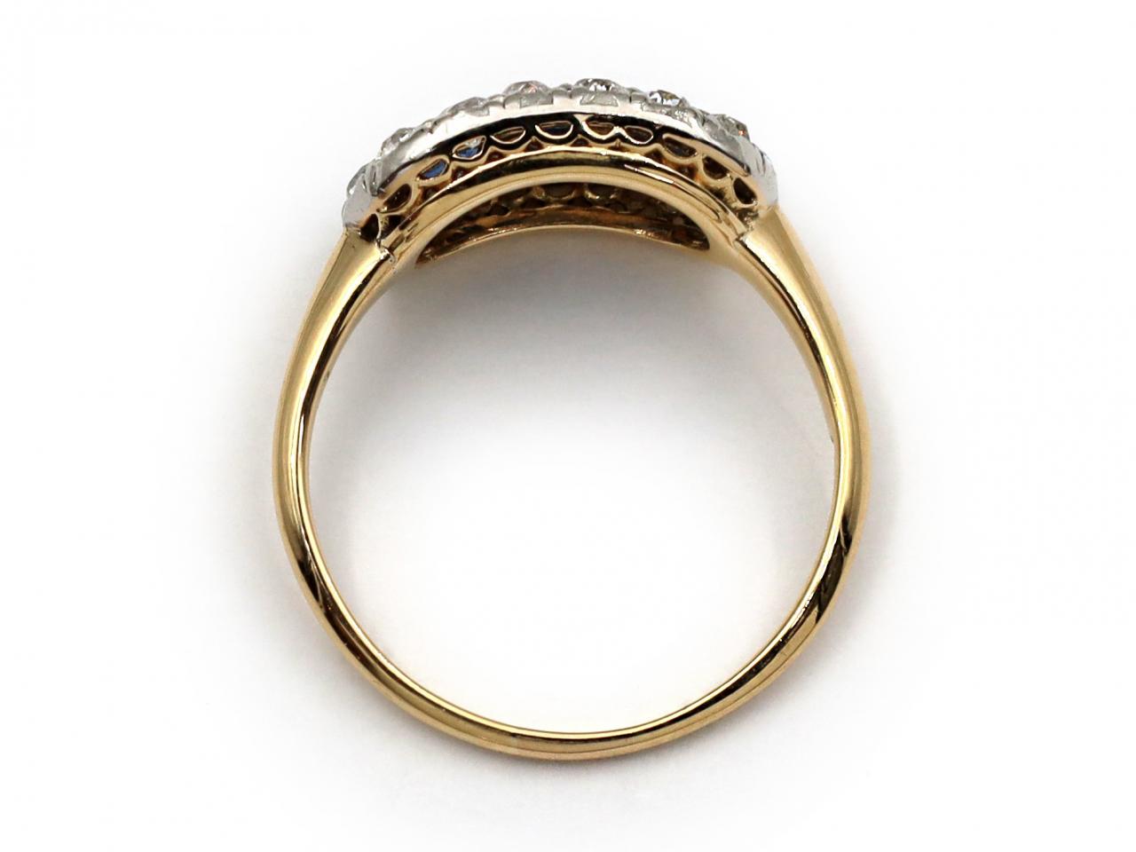 Edwardian sapphire and diamond three stone cluster ring in 18kt yellow gold. Centrally set with three cushion shape mixed cut sapphires in yellow gold settings, surrounded by cushion shape Old Mine cut diamonds in platinum settings, to a horizontal oval cluster with smooth border and fine scalloped gallery, flanked to either side by smooth shoulders which curve to a slim shank.