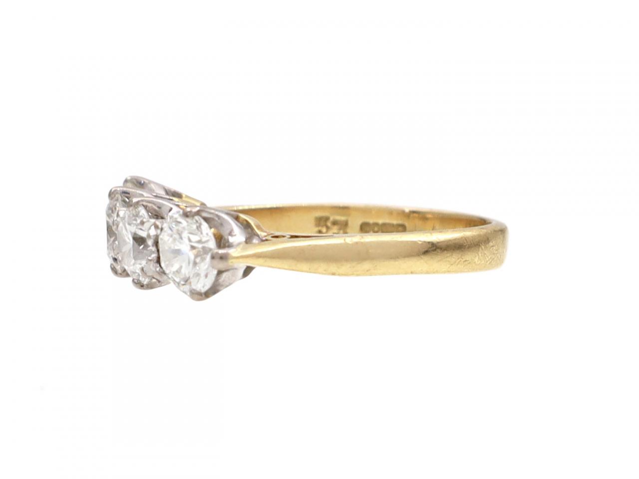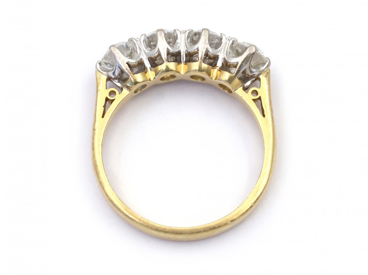 Edwardian style diamond four stone ring in 18kt yellow gold. Set across the finger with four round brilliant cut diamonds in raised platinum claw settings, to a four stone design with curving claws, pierced open gallery and raised inwardly tapering shoulders, supported by fine cheniers and flowing to a solid shank. Estimated total diamond weight 1.40cts. Estimated colour F-G. Estimated clarity VS. Hallmarked 18kt gold, London.