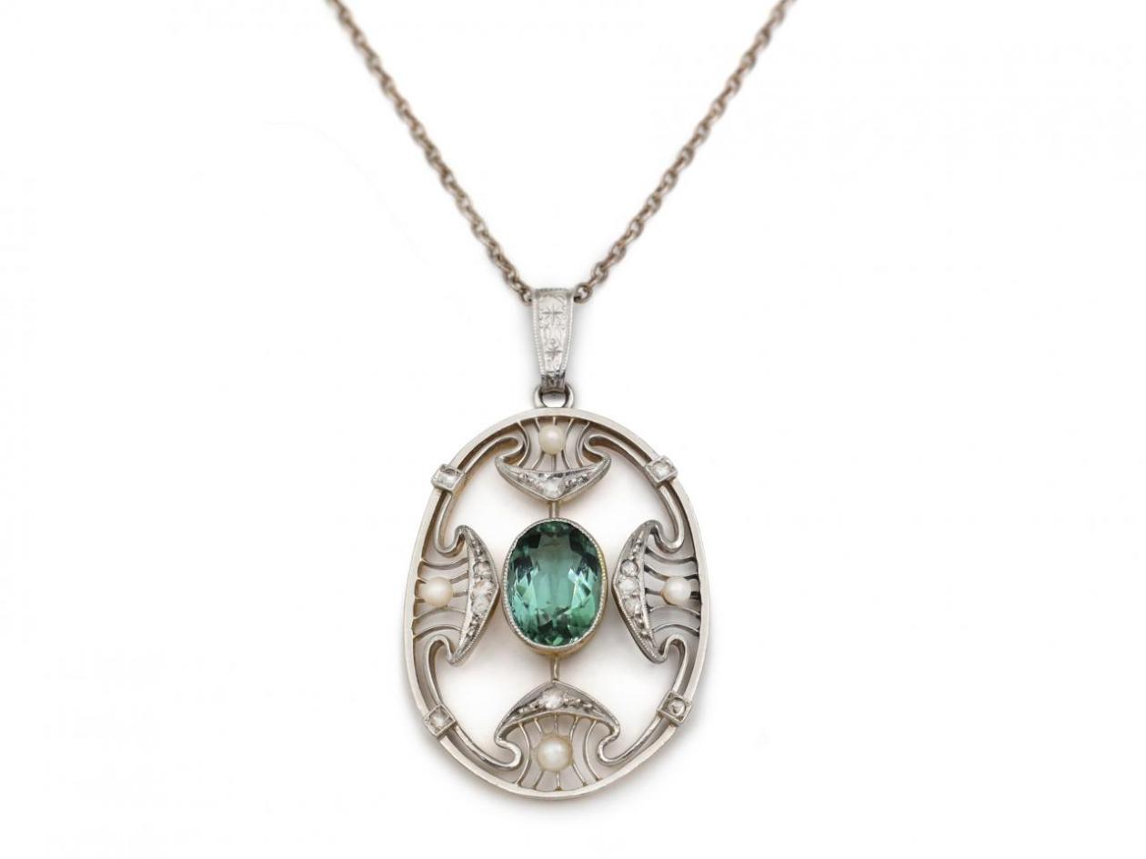 Edwardian tourmaline, diamond and pearl openwork pendant in platinum and 18kt yellow gold on a sterling silver chain. Set to centre with an oval mixed cut teal green tourmaline in a floating millegrain setting, surrounded by an openwork frame decorated with terminals set with rose cut diamonds in floating square collets and grain settings, further decorated by four seed pearls, fitted to top with a tapered engraved bale. Accompanied by a sterling silver trace chain.