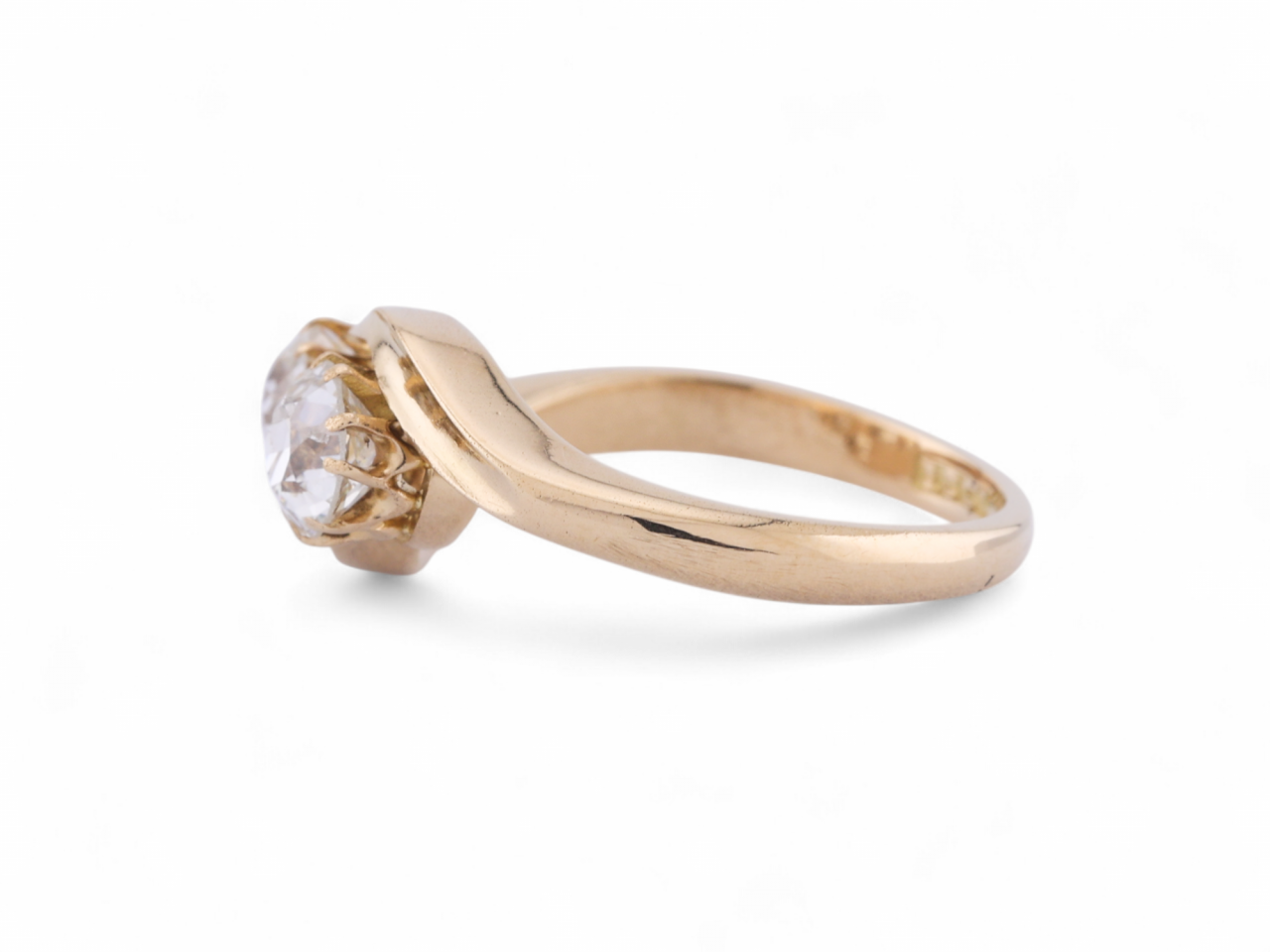 Comprising two old European cut diamonds of matched size and proportions, each secured in an eight-claw coronet setting and diagonally arranged in a crossover formation. The shoulders curve to frame the stones in a smooth twist design, leading to a plain D-section shank. Total estimated diamond weight 0.97cts, assessed as H–I colour and SI clarity. Edwardian period. Tested 18kt yellow gold.
