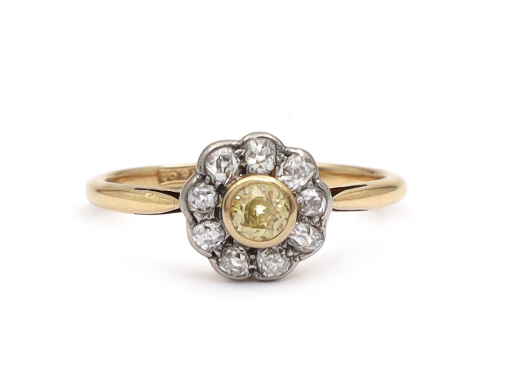 Fine Edwardian diamond cluster ring set in 18kt yellow gold with a platinum top. The central stone is a yellow diamond and surrounded by a cluster of old round cut diamonds.