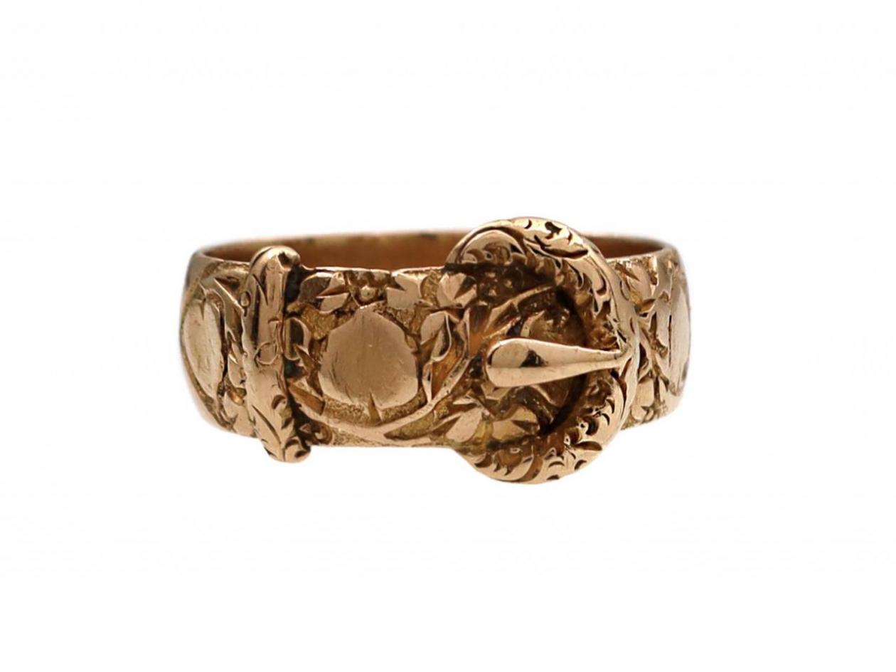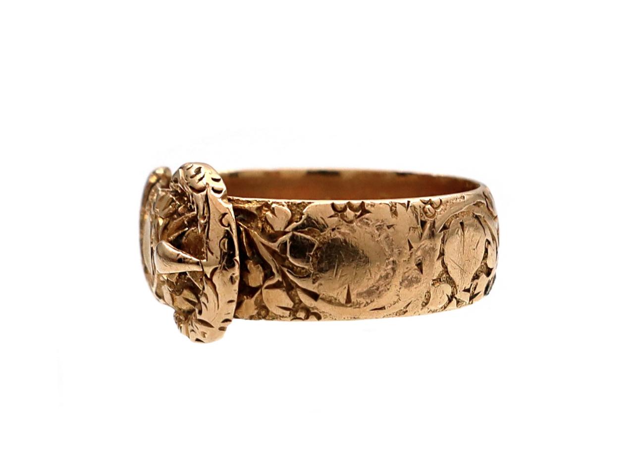 Edwardian 18kt yellow gold carved buckle ring. A broad band engraved throughout with floral and foliate motifs and fitted to the front with a carved buckle in relief. Hallmarked 18kt gold, Birmingham, 1903. Makers mark for Kinsey Brothers and Patrick.