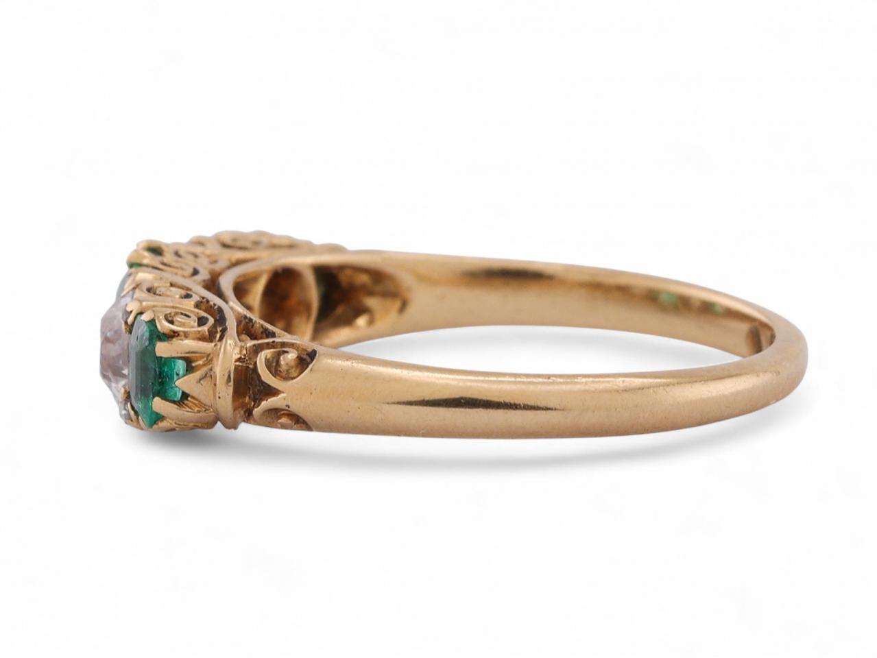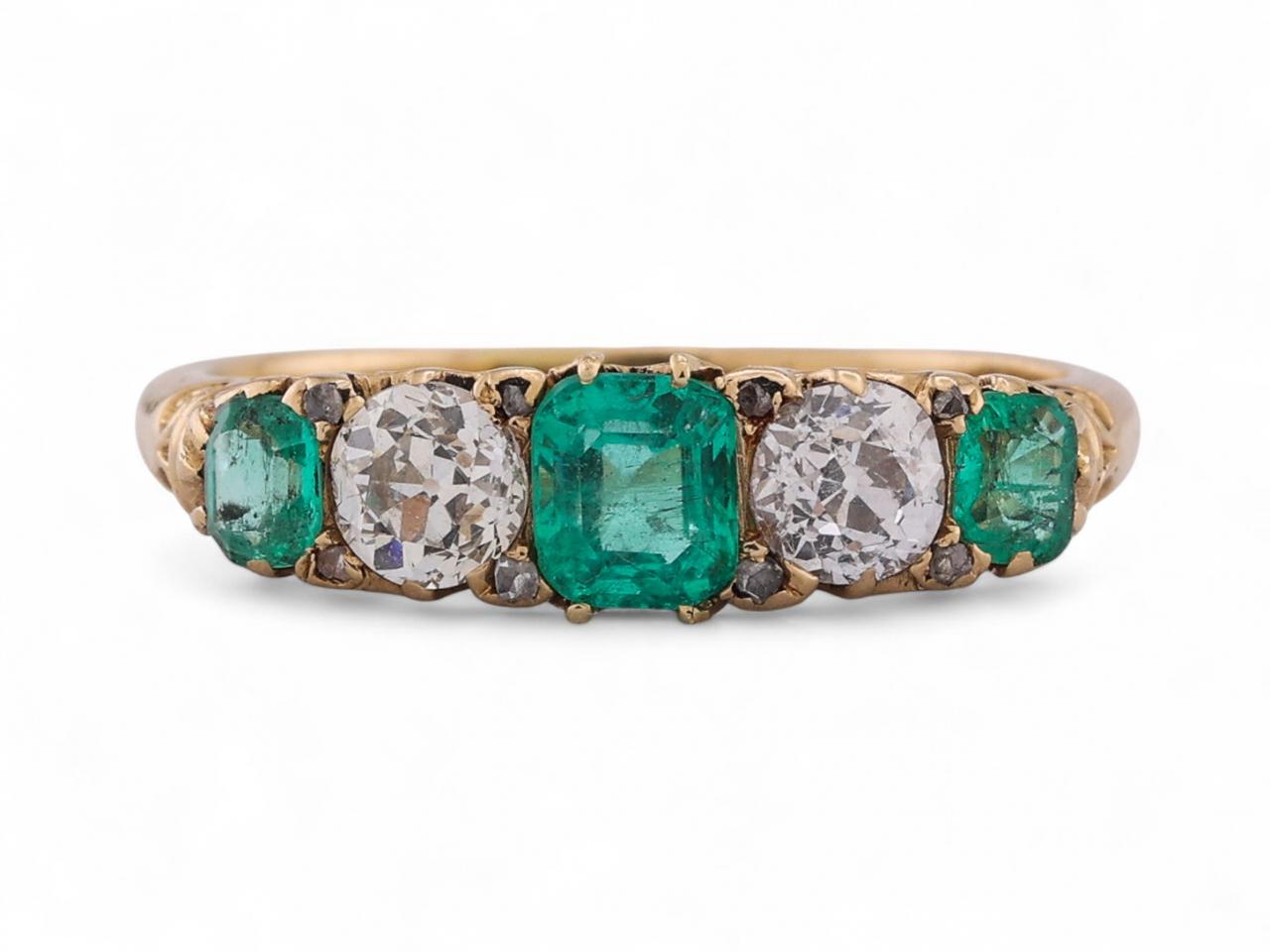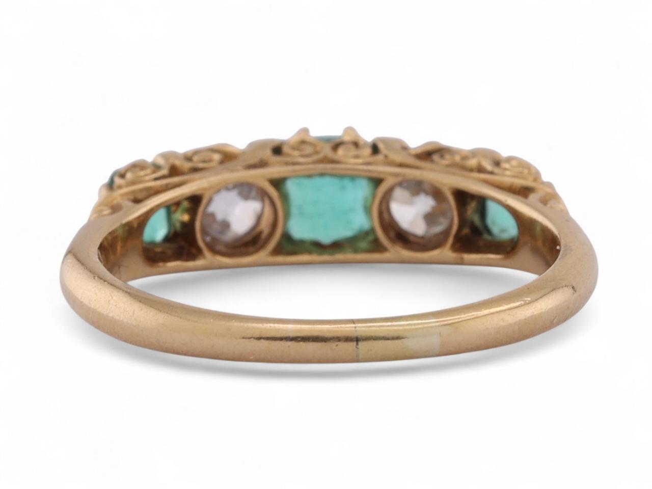 A five-stone ring set in 18kt yellow gold, featuring three vibrant step-cut emeralds alternating with two old European-cut diamonds, estimated total diamond weight 0.50 carat. The band is engraved to the shoulders with fine scroll detail.