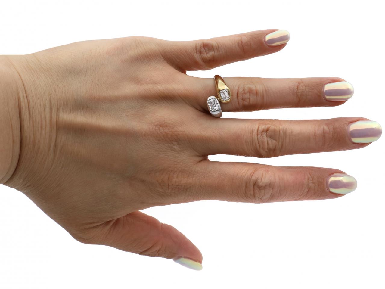 Emerald cut diamond 'toi et moi' open twist ring in platinum and 18kt yellow gold. Set with two rectangular emerald cut diamonds diamonds in rubover settings, to a two stone bypass design featuring flush settings, one in platinum and the other in yellow gold, curving and joining to a solid shank. Estimated total diamond weight 1.00cts. Hallmarked platinum and 18kt gold, Italian.