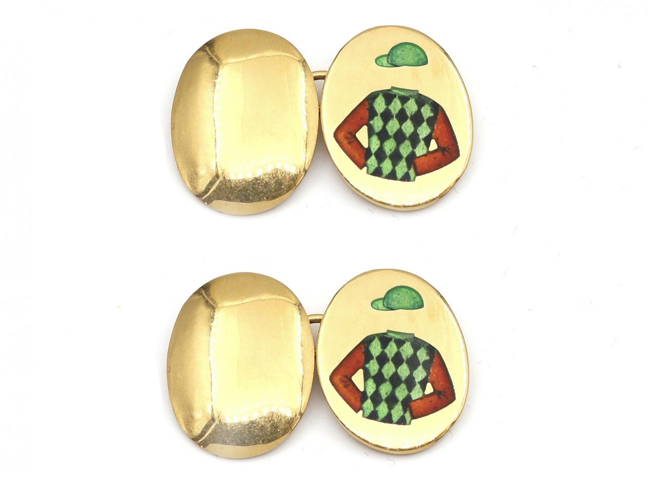 Enamel jockey cap and shirt double oval cufflinks in 9kt yellow gold. Hallmarked 9kt gold.