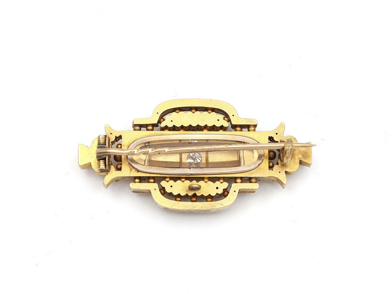 Etruscan revival 15kt yellow gold and diamond brooch.