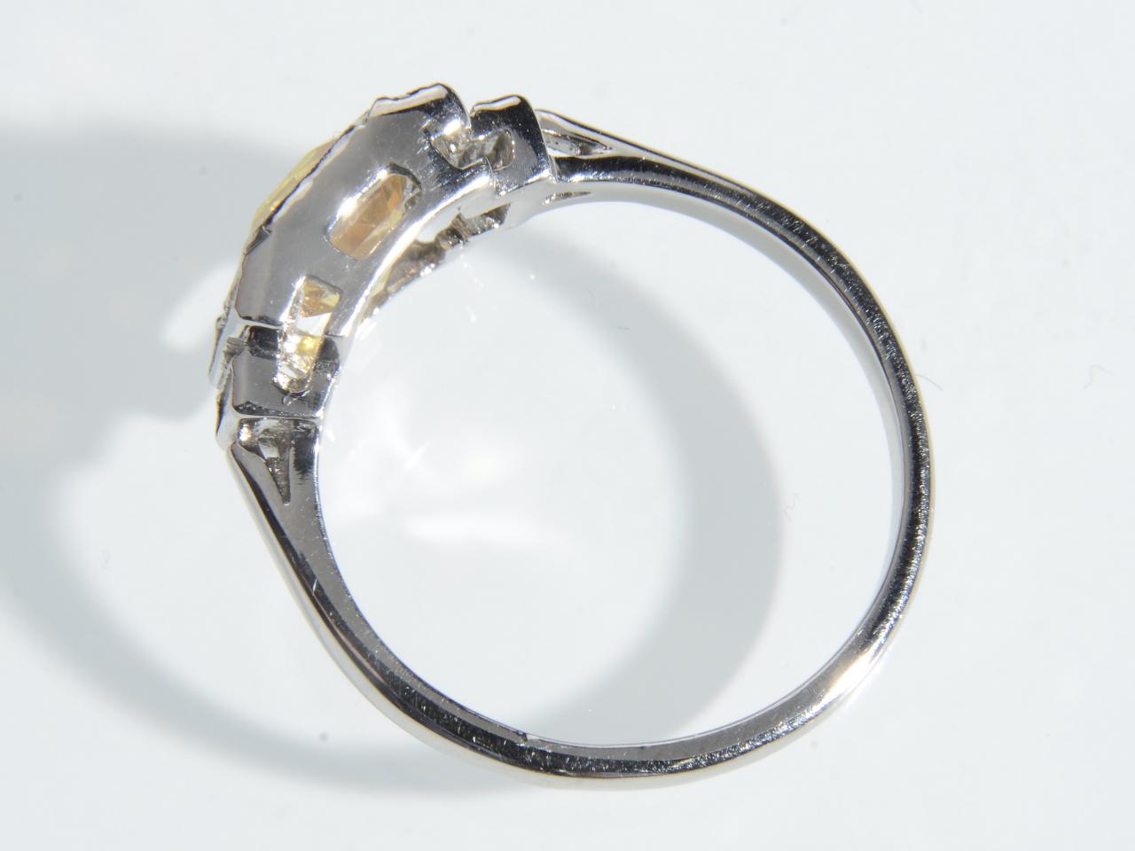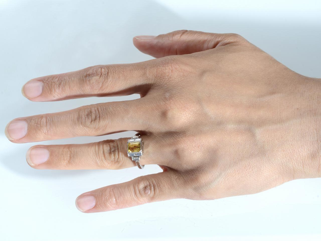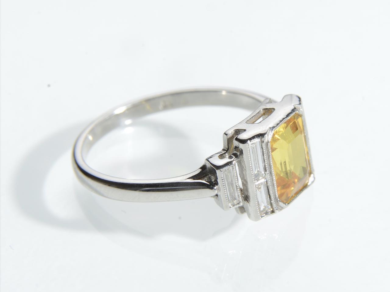 Fancy yellow sapphire and diamond Deco style ring in platinum, centred with an octangonal emerald cut yellow sapphire in a millegrain setting, flanked by vertically set rectangular baguette cut diamonds in channel and millegrain settings, to a step solitaire design with an architectural gallery and raised rounded shoulders which flow to a solid shank. Marked platinum.