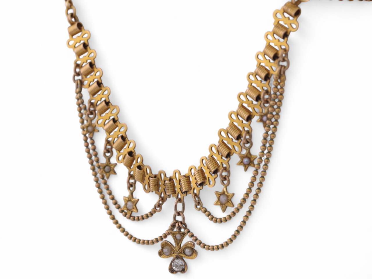 An Edwardian necklace of festoon design, composed of pierced gold links suspending chains and star-shaped drops set with seed pearls. The central pendant is accented with a diamond estimated at 0.07ct in a rubover mount. Gross weight 7.96 grams. Mounted in 9kt yellow gold with C-clasp fitting.