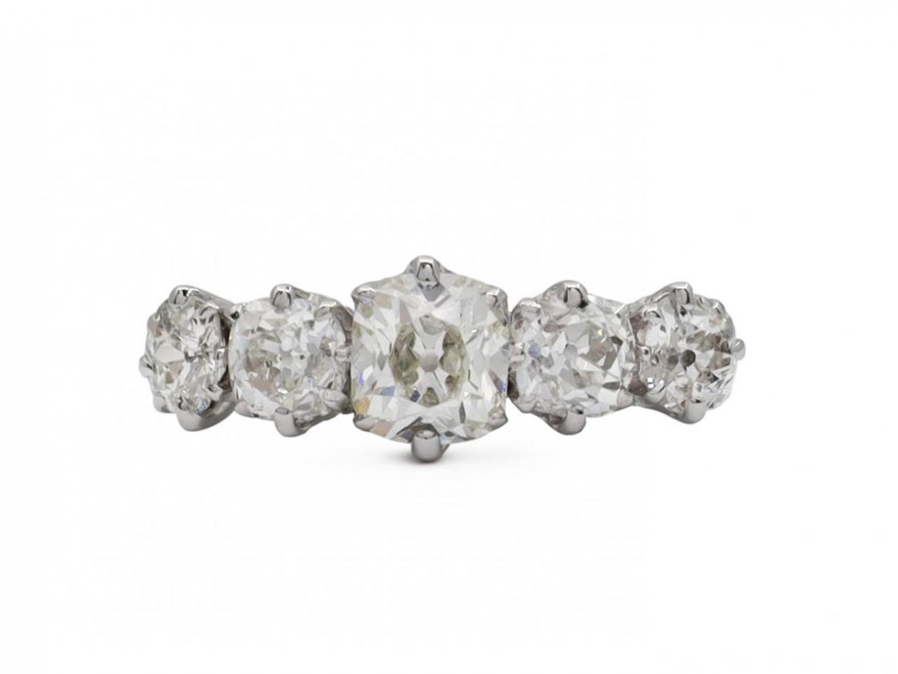 Five stone Old Mine cut diamond ring in 18kt white gold. Centred with an estimated 0.85ct cushion shape Old Mine cut diamond in a claw setting, flanked by four cushion shape Old Mine cut diamonds in claw settings, to a graduating five stone design with curving claws and pierced gallery, the inwardly tapering shoulders smooth to a slim shank. Estimated total diamond weight 2.10cts.