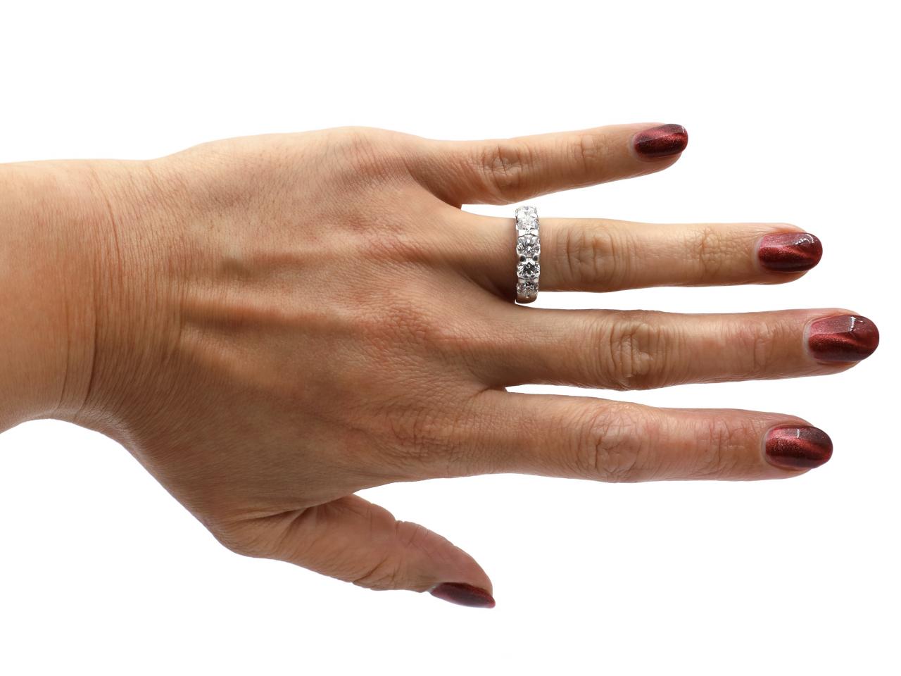 Five stone round brilliant diamond ring in platinum. Set across the the finger with five round brilliant cut diamonds in fancy claw settings, to a a chunky five stone ring with smooth claws, polished gallery and fitted to either side with integrated shoulders which curve to a solid shank. Hallmarked platinum.