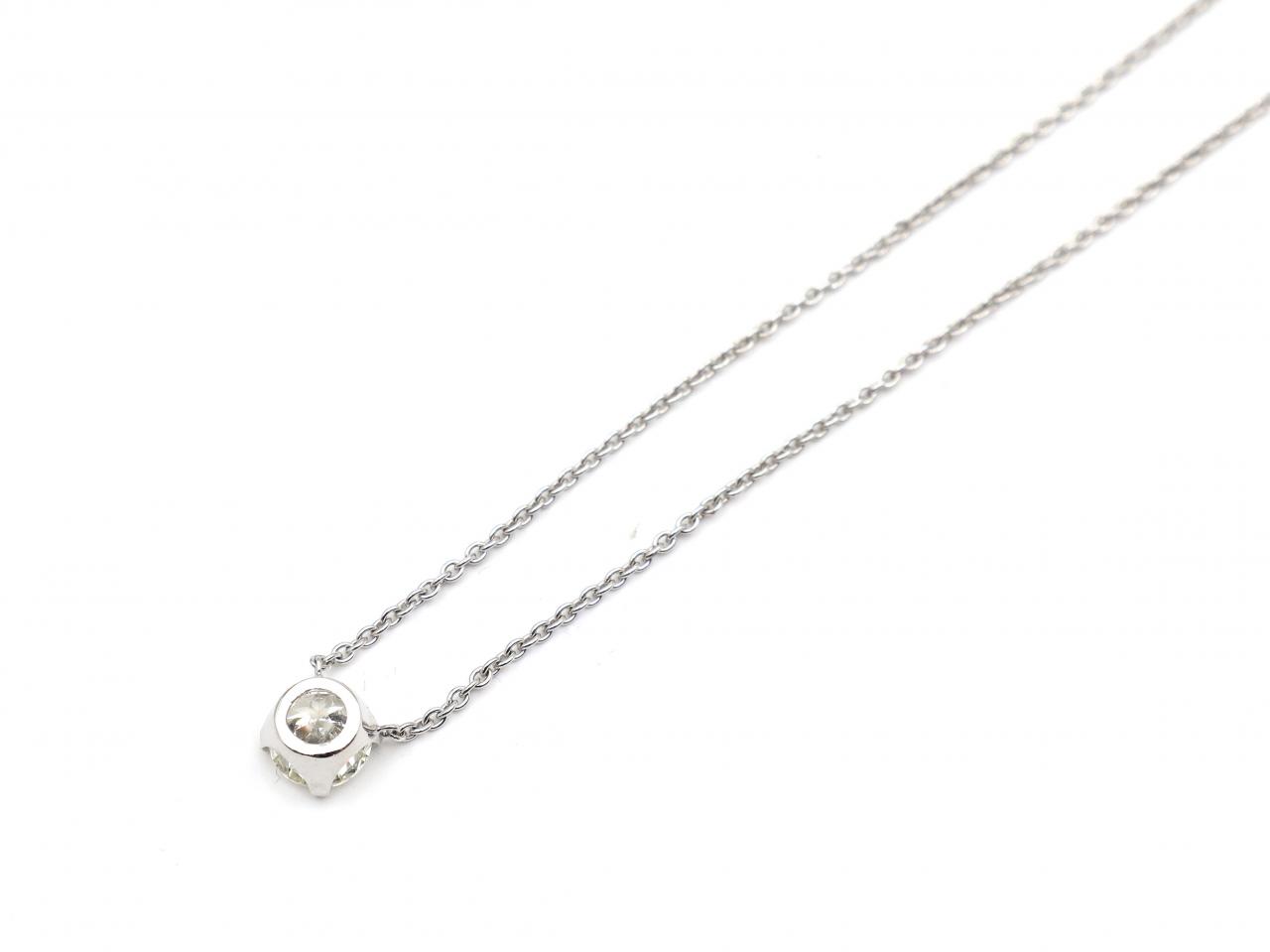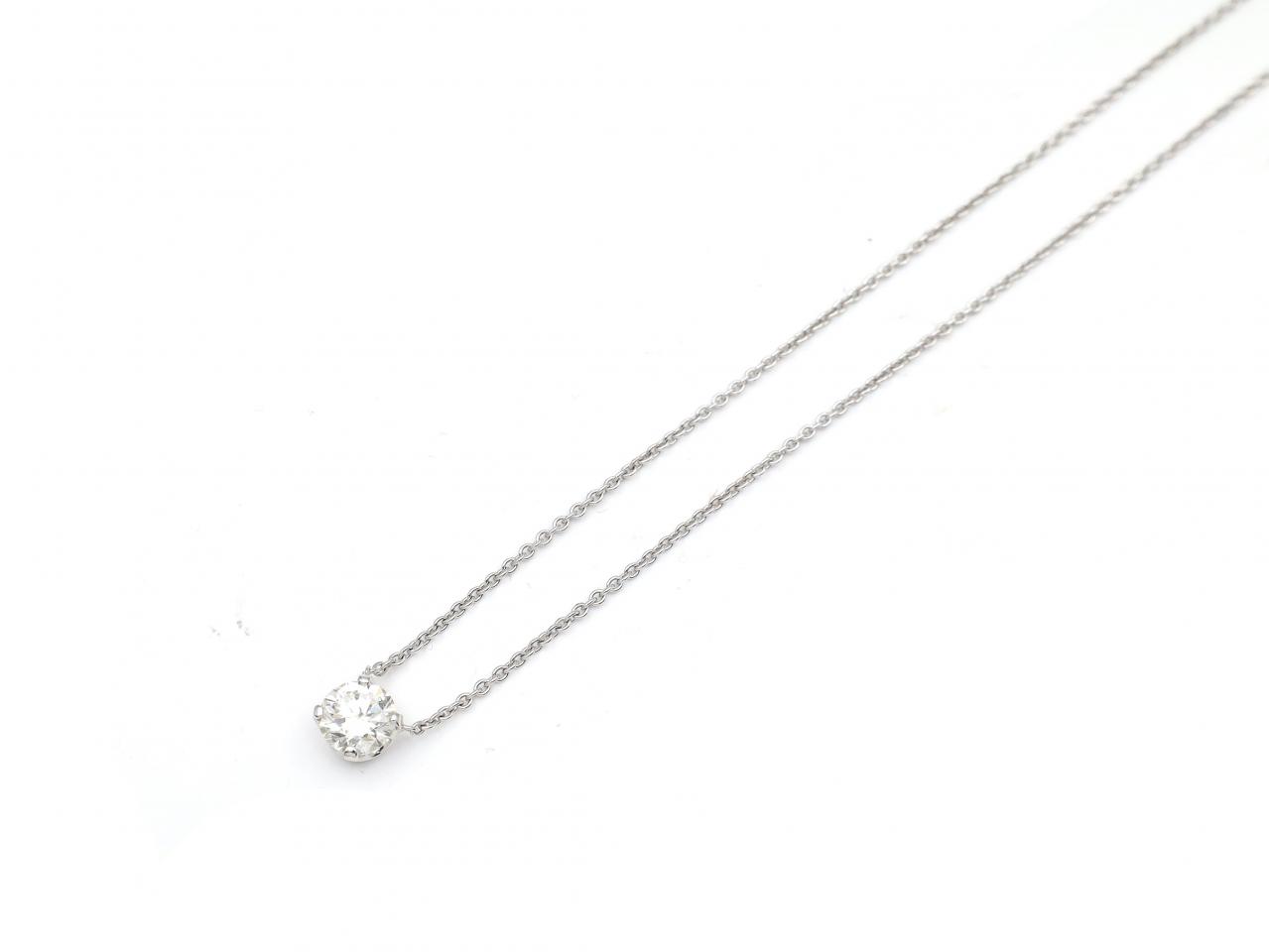 Floating diamond solitaire pendant and chain in white gold. A fine trace chain in 18kt white gold, fitted with a blot ring closure and centred with a four claw collet set with a 1.00ct round brilliant cut diamond, I colour, SI1 clarity.