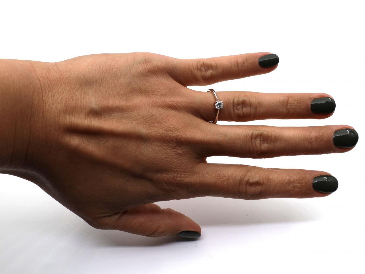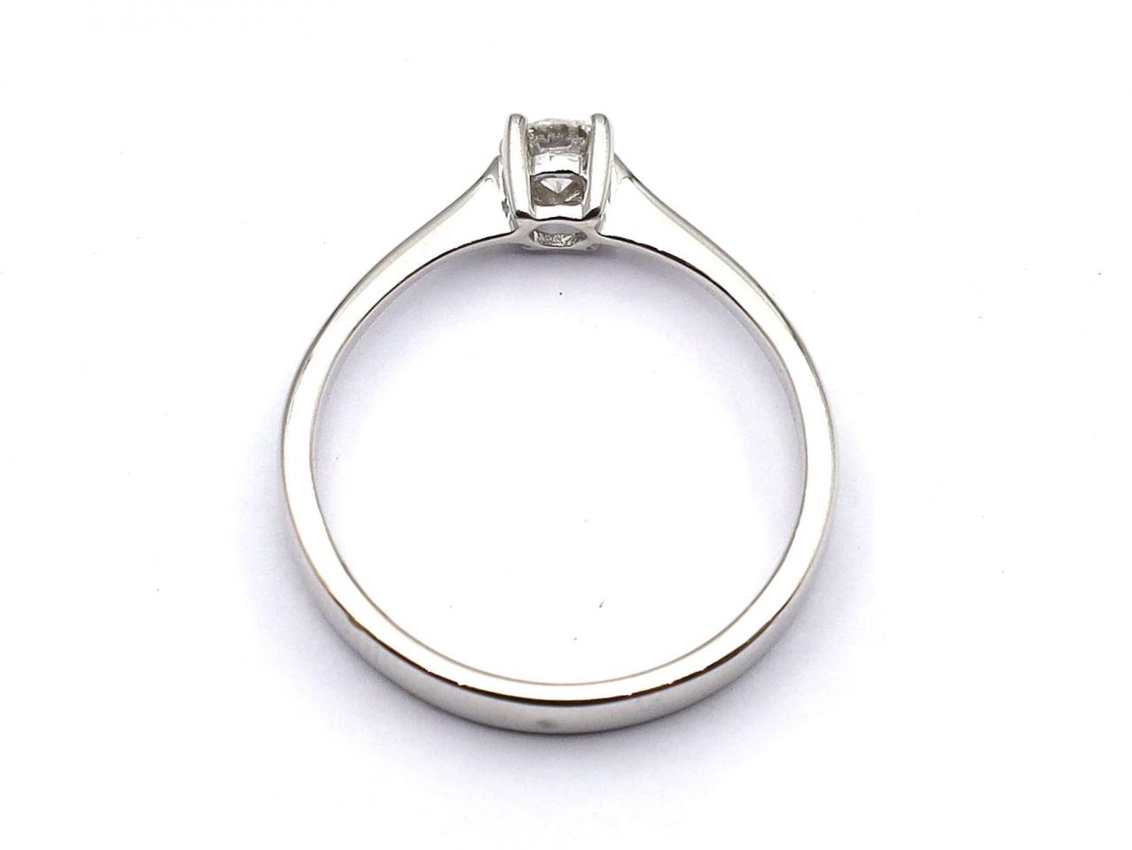 Four claw round brilliant cut diamond solitaire ring in 18kt white gold. Set with a 0.26ct round brilliant cut diamond in a four claw collet, the inwardly tapering shoulders broaden to a solid shank. Hallmarked 18kt gold.