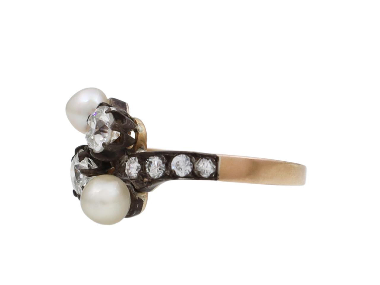 French antique diamond and natural pearl four stone ring in silver on 18kt yellow gold. Centred with two round Old European cut diamonds in silver claw settings, adjacently set with two natural pearls, to a asymmetrical cluster design with curved claws, pierced collets and flanked to either side with twisting diamond set shoulders in silver grain settings, terminating to a smooth solid shank. Estimated total diamond weight 0.75cts. Hallmarked 18kt gold, French.