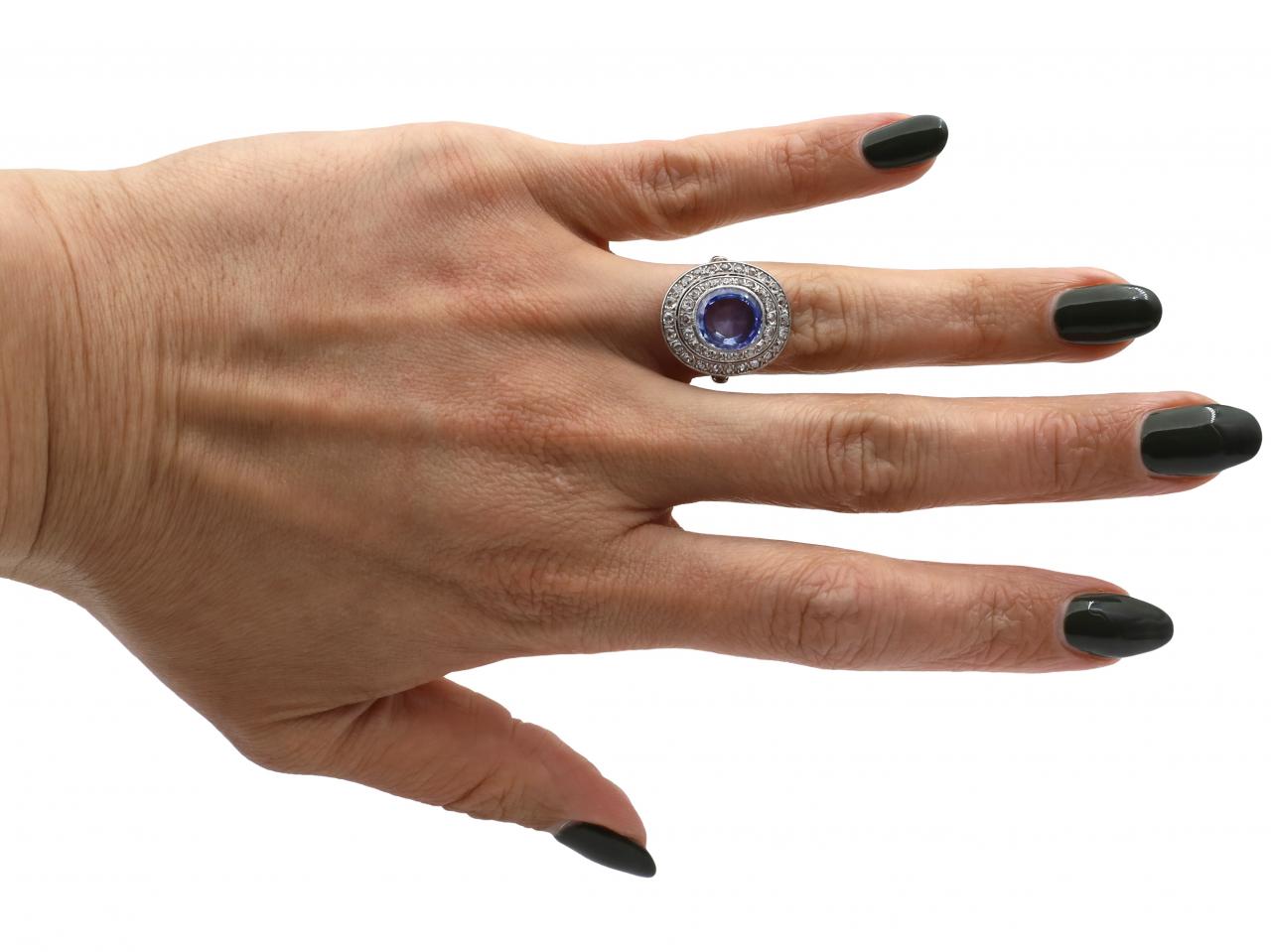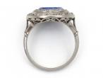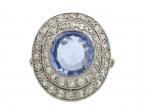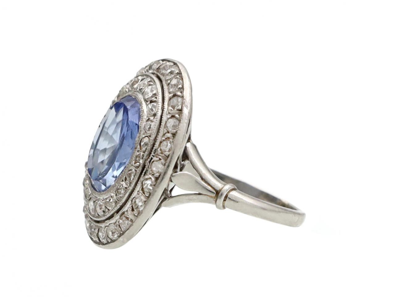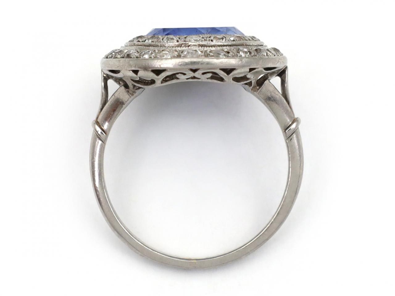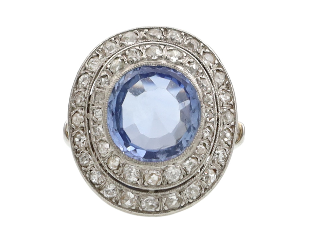 French Art Deco Ceylon sapphire and diamond double row cluster ring in platinum. Set with an estimated 2.80ct round mixed cut Ceylon sapphire with no indication of heat treatment in a millegrain setting, encircled by two rows of round eight cut diamonds in grain settings, to an oval concentric cluster ring featuring open negative space, millegrain borders, pierced scrolling gallery and flanked to either side with tri-split fleur-de-lis shoulders which terminate to a solid shank. Hallmarked platinum, French.