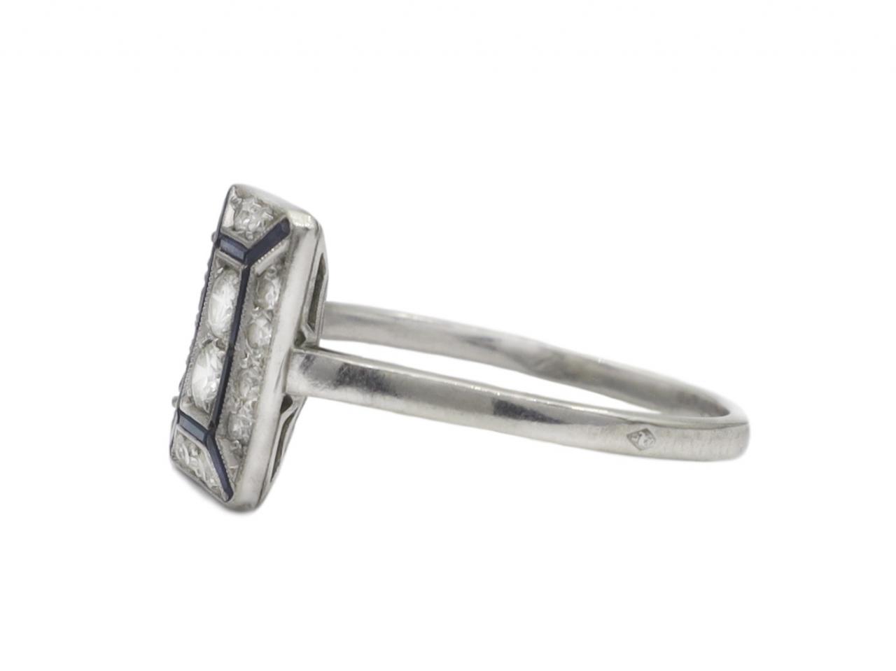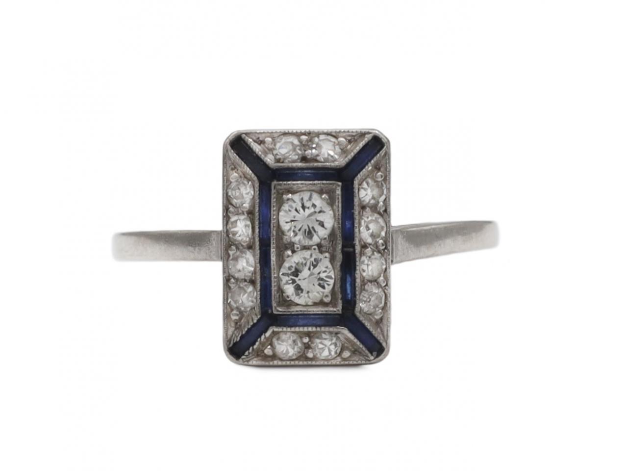 French Art Deco diamond and sapphire rectangular cluster ring in platinum. Set with two round old cut diamonds in a rectangular grain setting, bordered and framed by rectangular callibre cut sapphires in platinum millegrain settings, further surrounded by twelve round old cut diamonds in platinum grain settings, to an elongated geometric cluster with smooth settings, pierced gallery and flanked by raised slightly trumpeting shoulders which smooth to a slim shank. Hallmarked platinum, French.