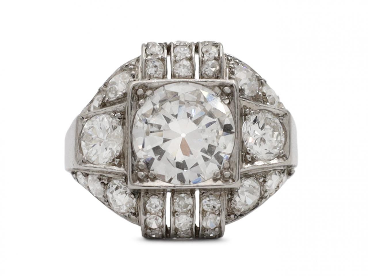 French Art Deco geometric diamond bombe cluster ring in platinum. Centrally set with an estimated 1.60ct round Old European cut diamond in a square collet setting, flanked by two round Old European cut diamonds in tapered collet settings, set to top and bottom with six vertical rows of eighteen round eight cut diamonds in grain settings, further embellished with twelve round Old European cut diamonds in grain settings, to a bold cluster design with polished collets, negative spacing, low settings and integrated trumpeting shoulders which smooth to a solid shank. Hallmarked platinum, French.