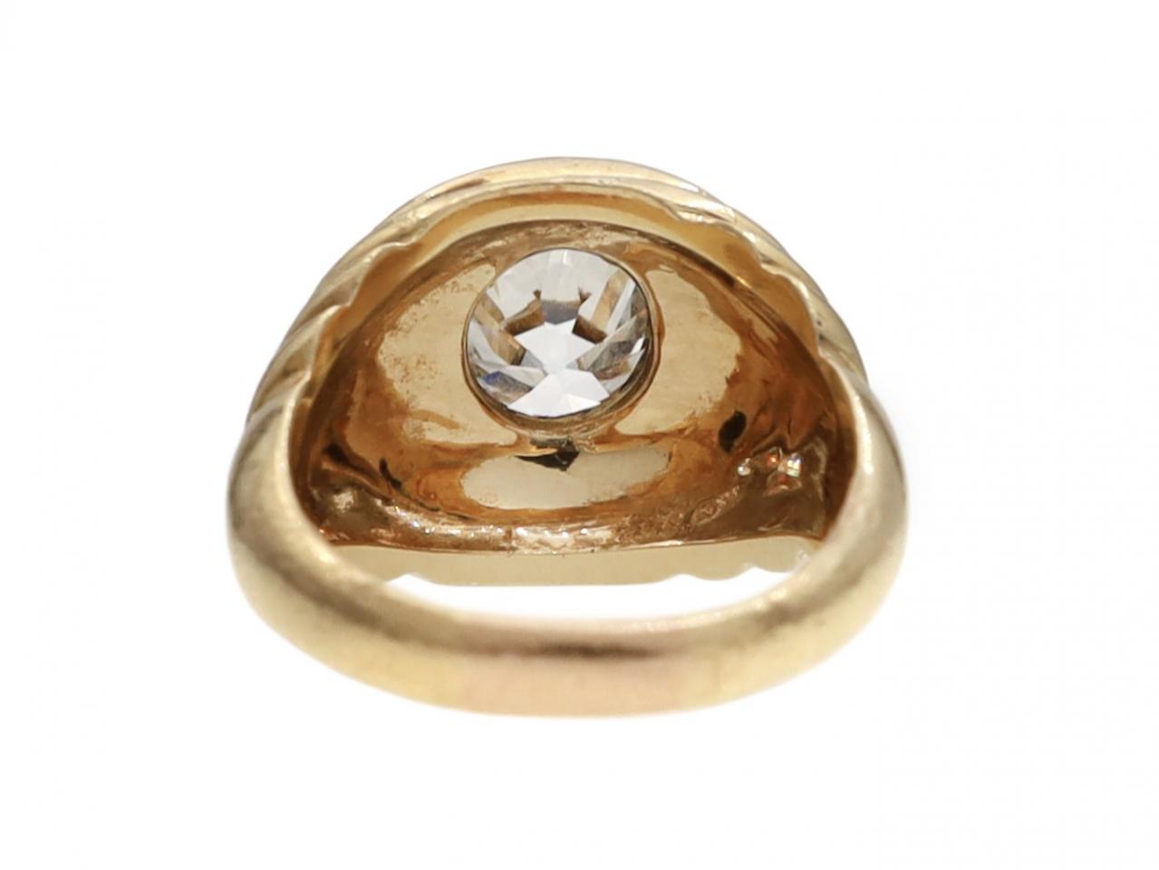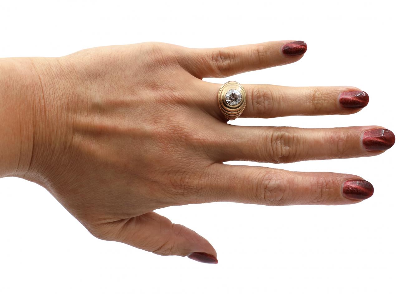 French retro 1.80ct diamond 'Bibendum' ring in 18kt yellow gold. Set with an estimated 1.80ct round Old European cut diamond in a rubover setting, to a terrace concentric surround which continues to a bombe shape with integrated shoulders which slowly taper to a solid shank.