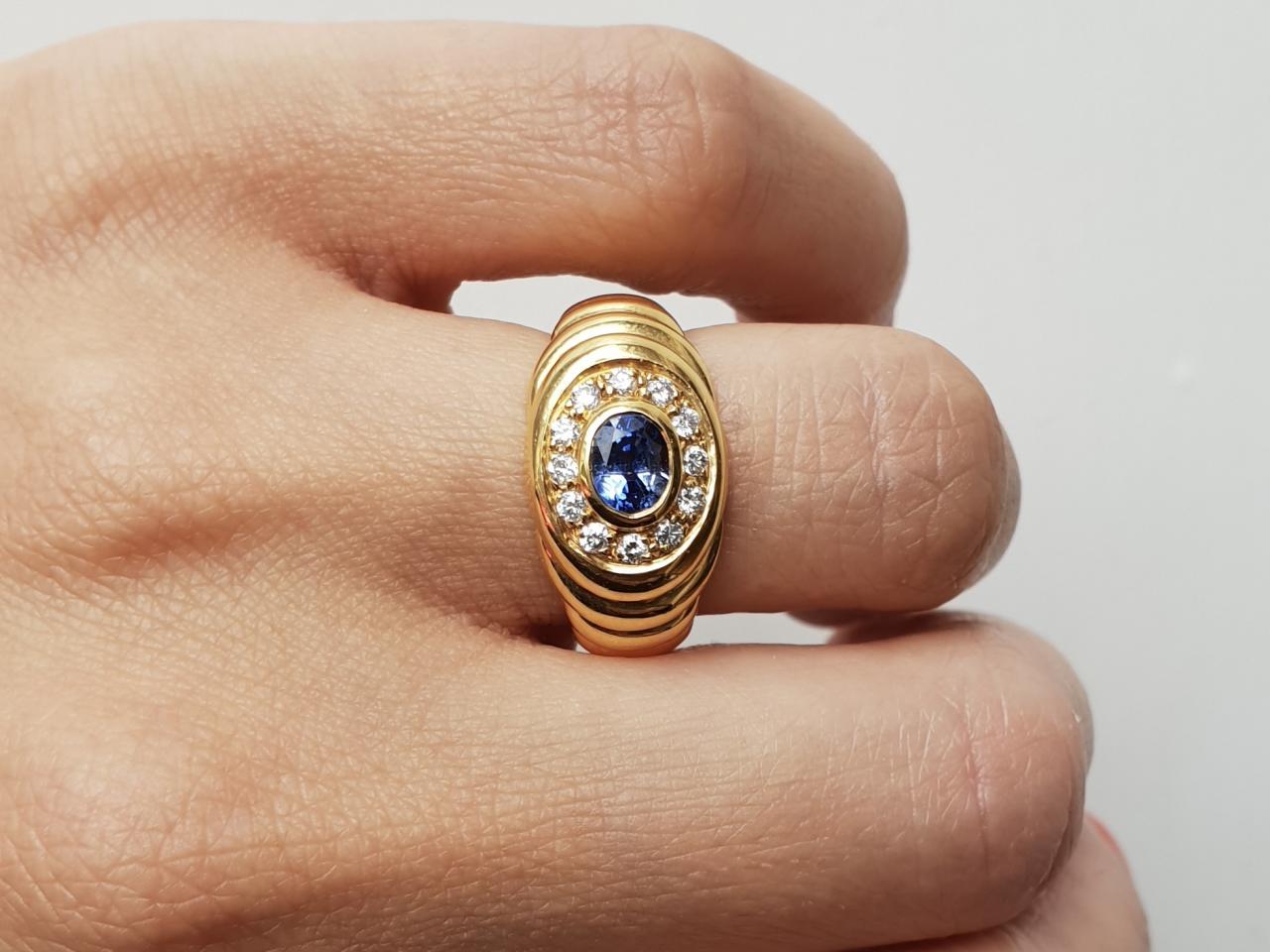 French retro sapphire and diamond terraced bombe cluster ring in 18kt yellow gold. Centred with an oval mixed cut sapphire in a rubover setting, encircled by a row of twelve round brilliant cut diamonds in grain settings, to an oval cluster surrounded by deeply incised concentric ribbing to the gallery and continuing down the shoulders before smoothing to a solid shank. Hallmarked 18kt gold, French.