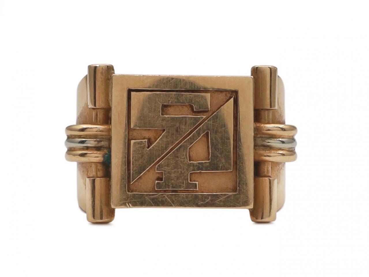 French vintage initial 'S P' signet ring in 18kt yellow gold. Centred with a square plaque carved in relief with intials 'S' and 'P' in angular letters, flanked by broad industrial shoulders featuring three-dimensional tubing and tri-gold loops before curving to a solid shank. Hallmarked 18kt gold, French.
