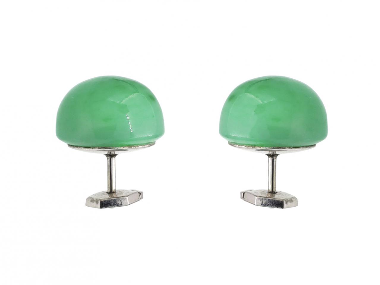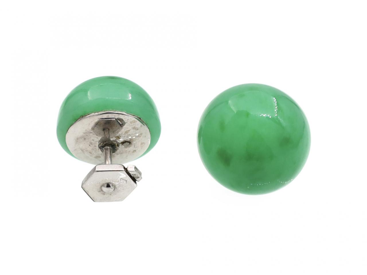 French vintage jade cabochon stud earrings in platinum. A matching pair of earrings, each set with a circular cabochon cut jade, fitted to the reverse with a secure post and omega disk. Marked platinum, French.