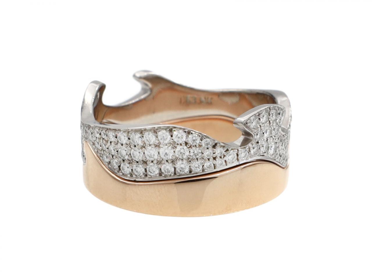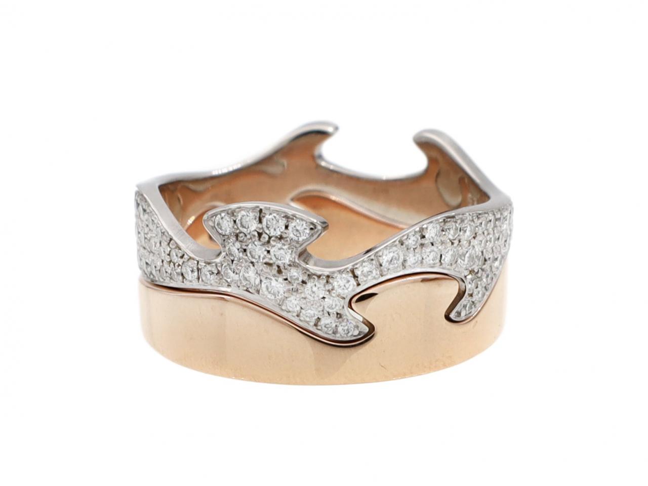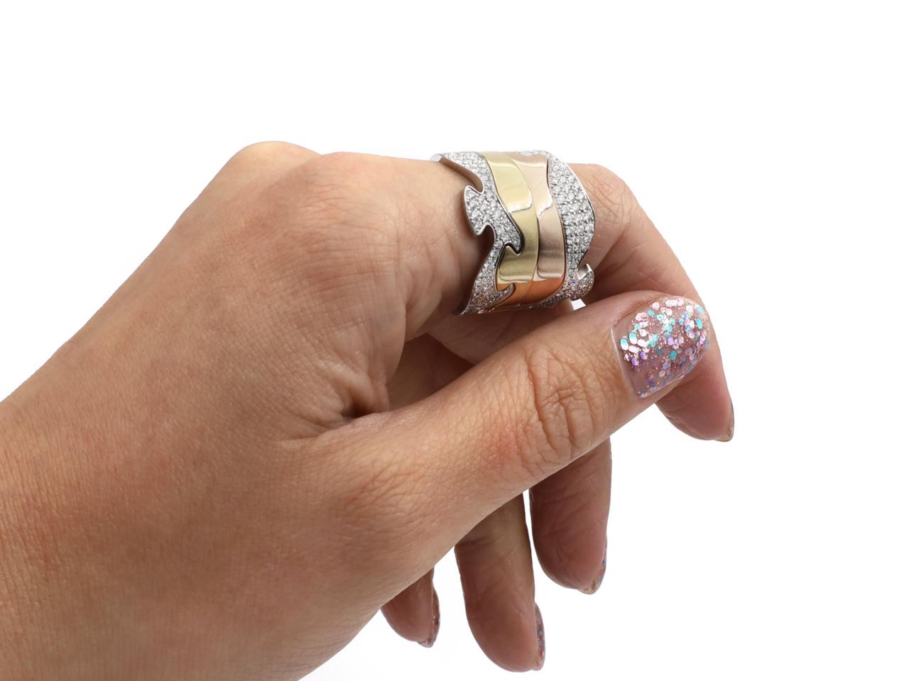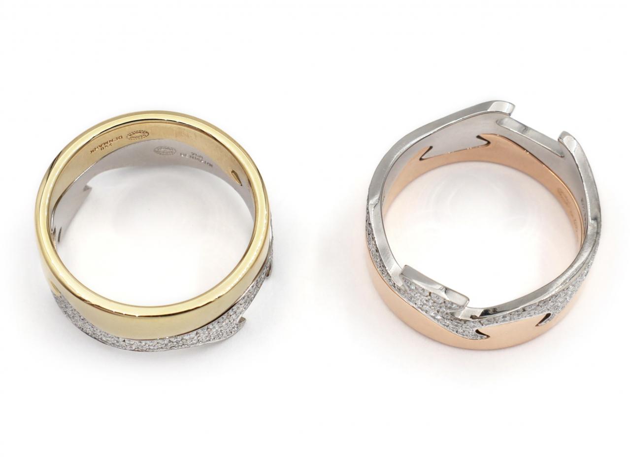 Georg Jensen 4pcs Fusion ring in 18kt rose, yellow and white gold. Consisting of four bands fitting together, one in polished rose gold, two in white gold set with round brilliant cut diamonds in pave settings and one in yellow gold. Hallmarked 18kt gold, Danish. Signed 'GEORG JENSEN'.