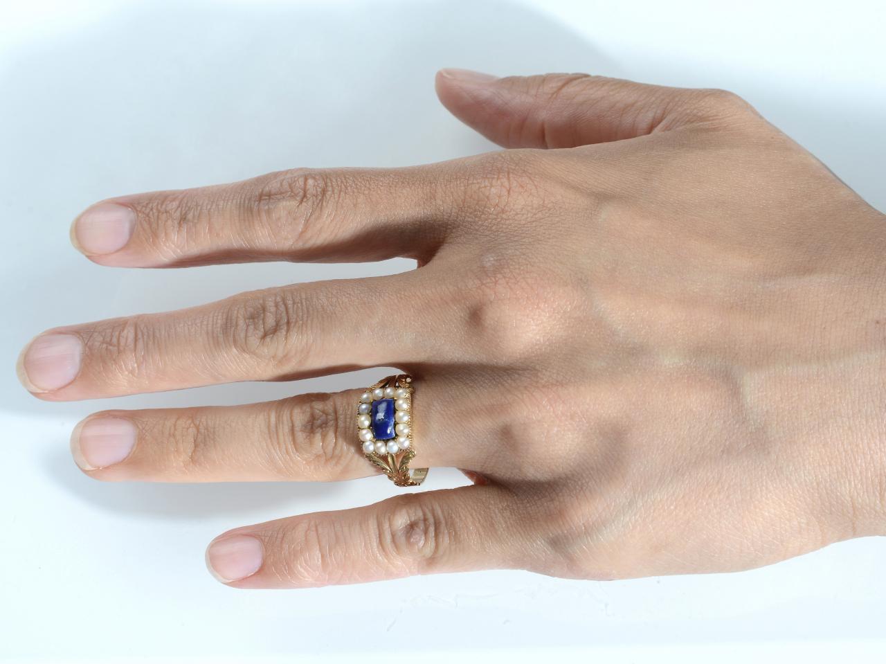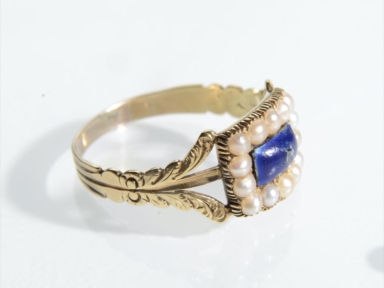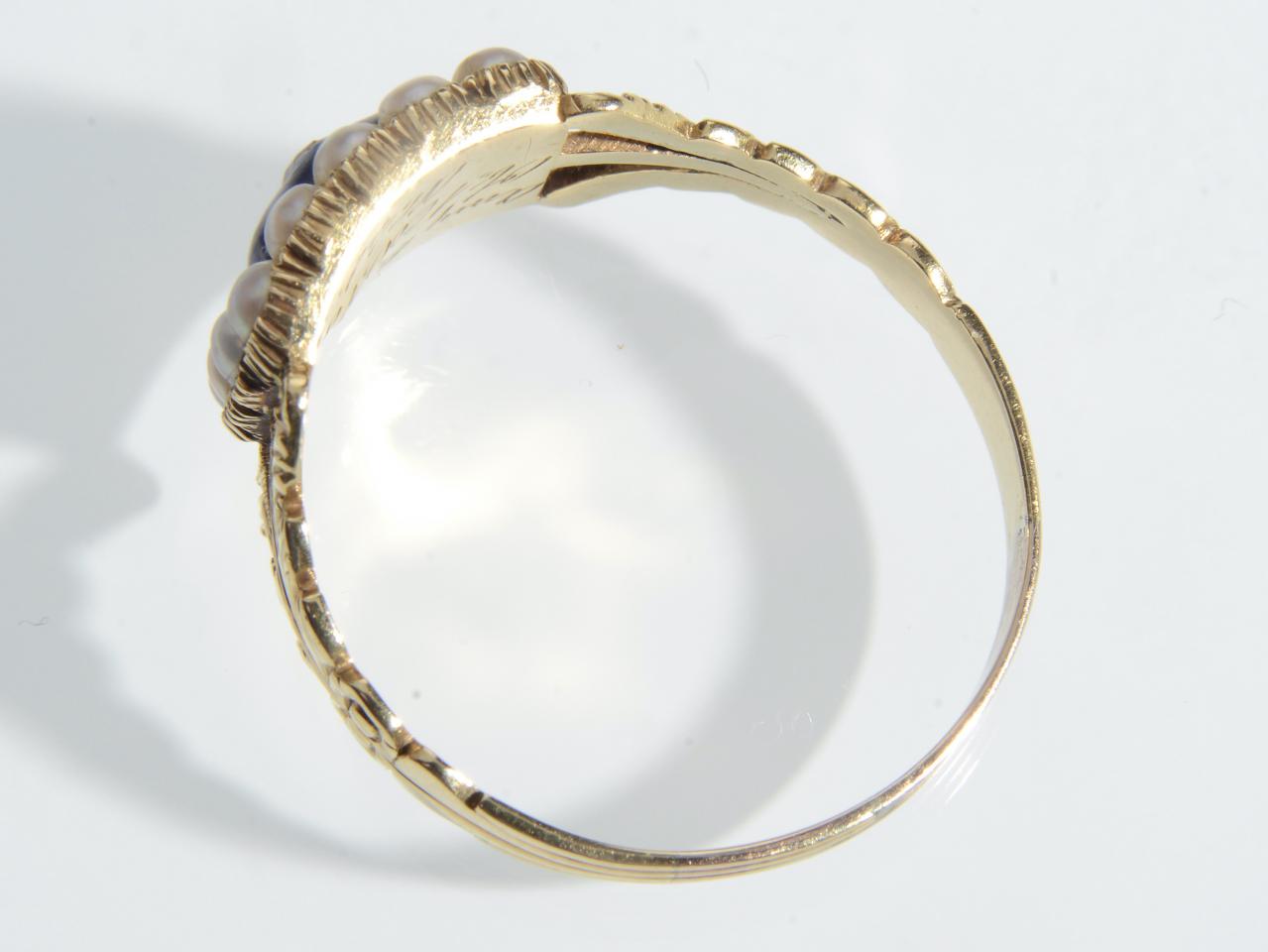 Georgian diamond, blue enamel and pearl memorial ring in 18kt yellow gold, centrally set with a rose cut diamond surrounded by a domed rectangular plaque decorated with blue enamel and bordered by natural seed pearls in cutdown settings, flanked by tri-split shoulders with feathering motifs and ornate engraving before terminating to a ribbed shank. Inscribed to the reverse: ' Amy Bonifire Ob 1 Oct 1820 At 44'.