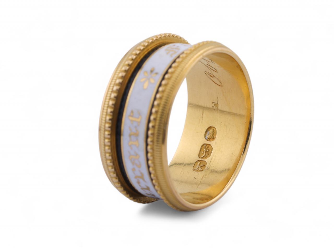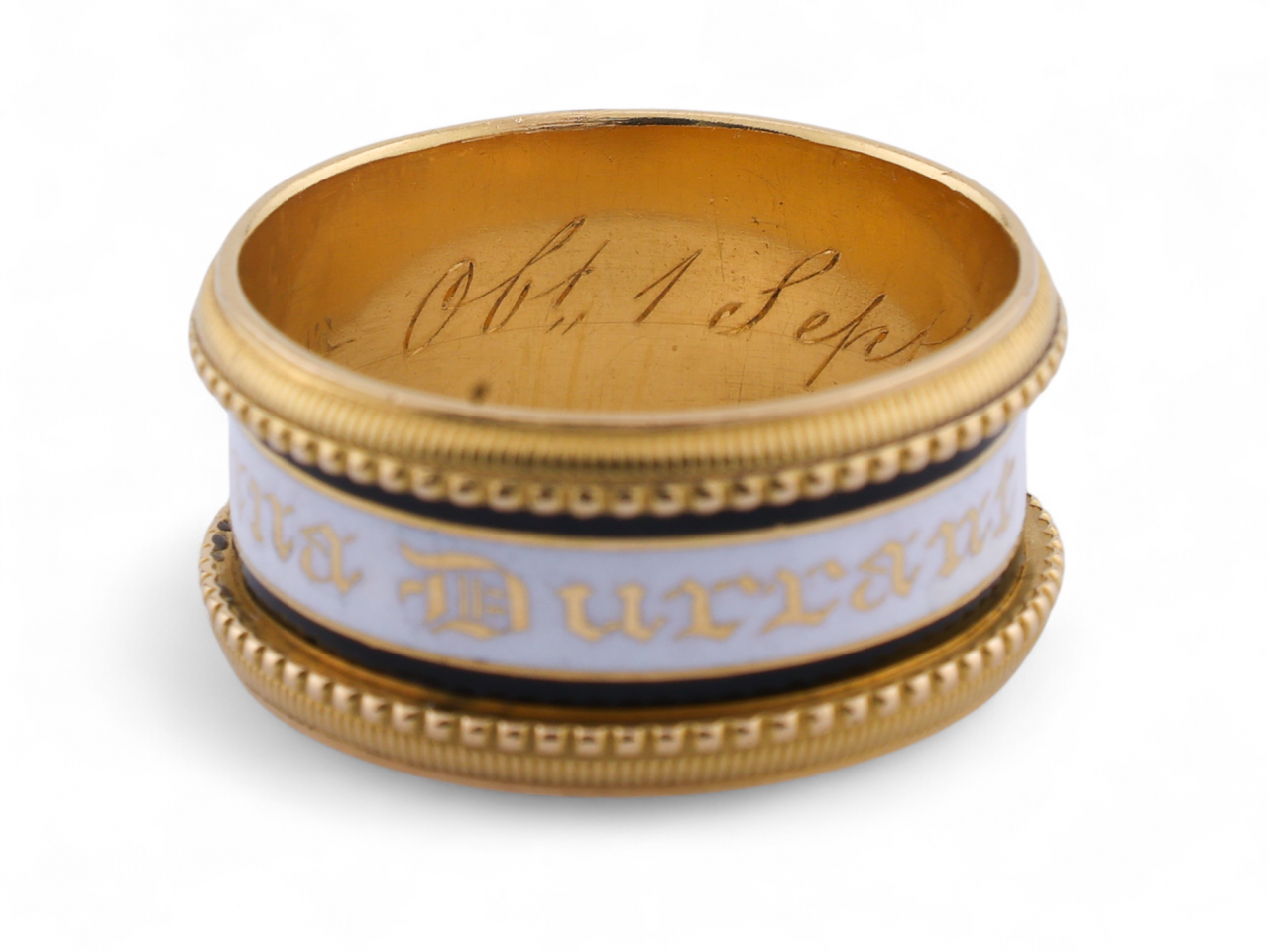 'Ob. 1st Sept 1825 at 24' Rare Georgian mourning ring in 22kt yellow gold with white enamel, dated 1825.