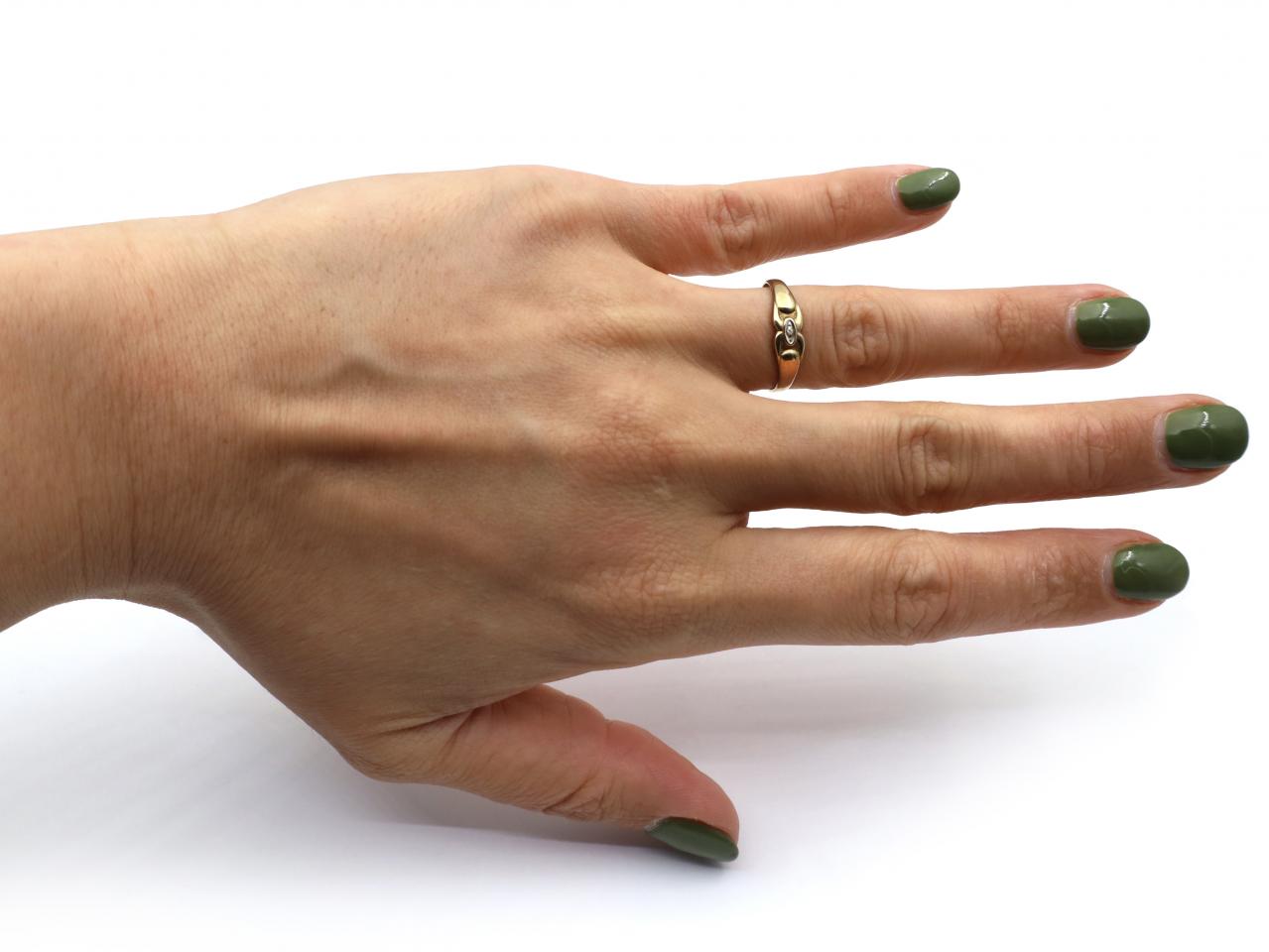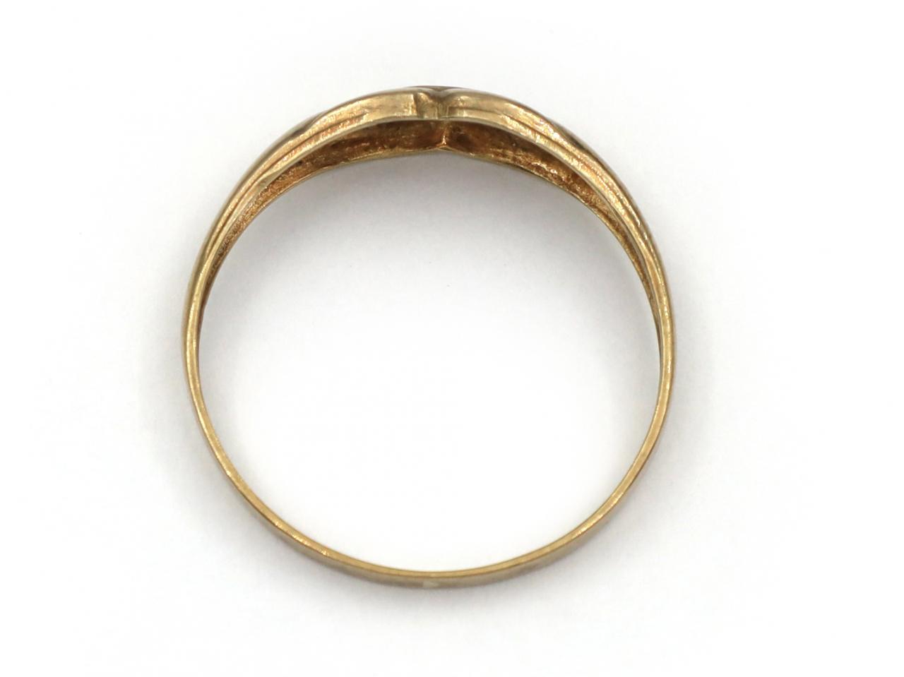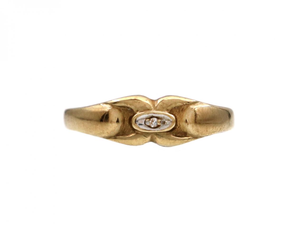 German diamond set buckle ring in 8kt yellow gold. Centred with a round eight cut diamond in a grain setting, to a crossover design with integrated shoulders which taper to a slim shank. Marked 8kt gold, German.
