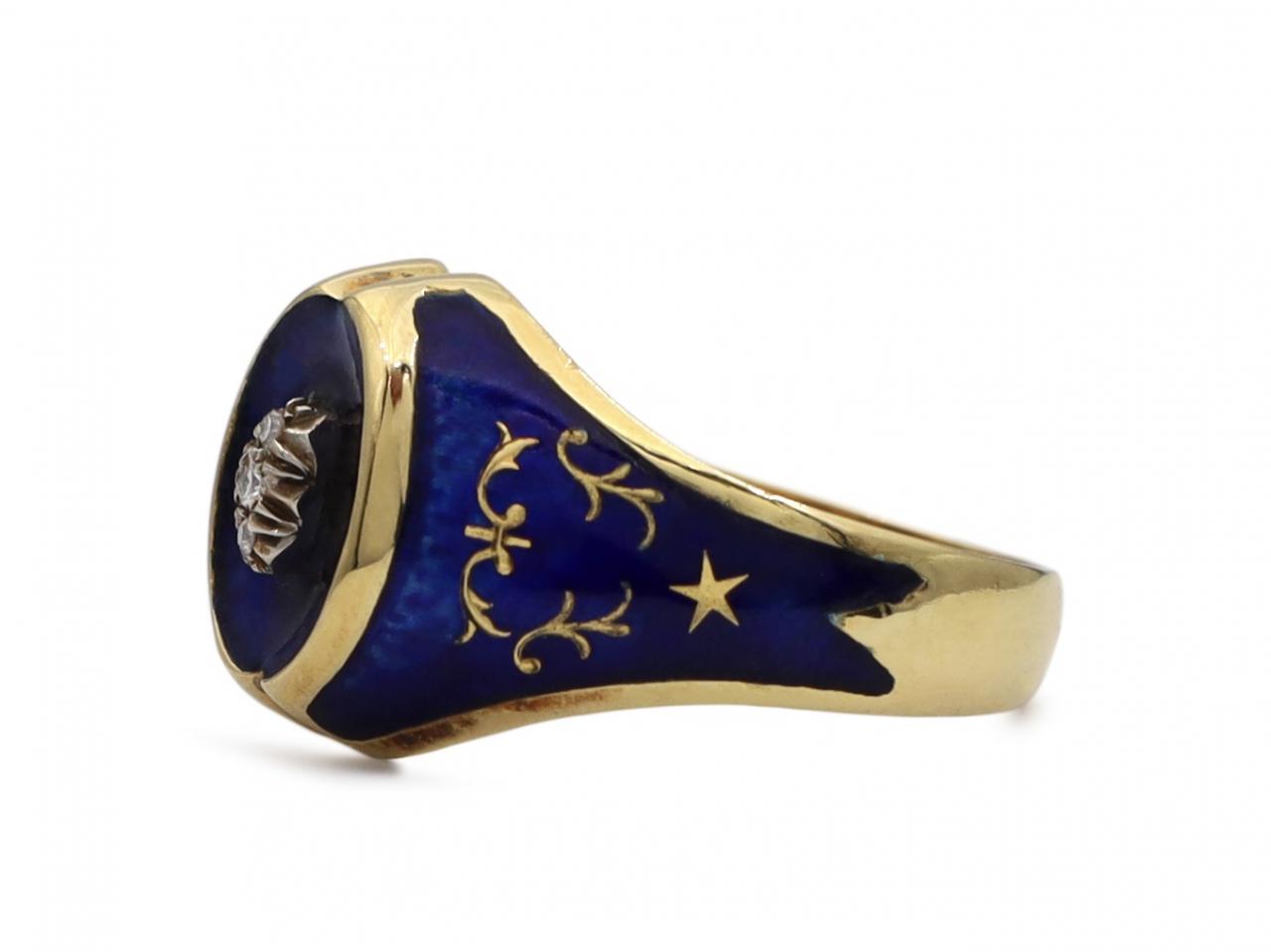 Italian vintage diamond, royal blue enamel and 18kt yellow gold signet ring. A concave oval signet centred with three vertically set round diamonds in silver cutdown settings, met to either side with broad integrated shoulders which taper to a solid shank, decorated throughout with royal blue enamel and polished borders and foliate patterns and five pointed stars in relief.