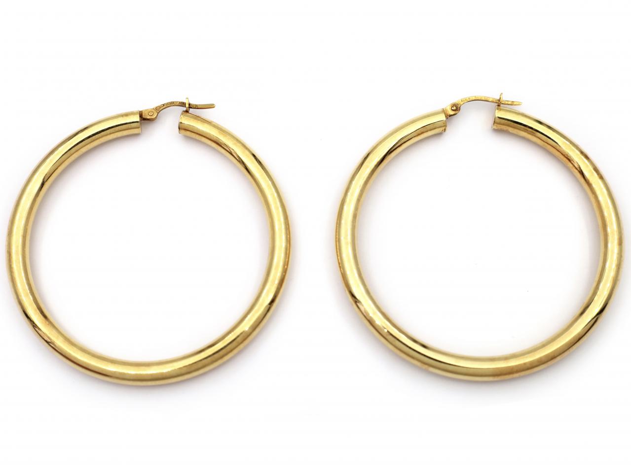 Large vintage 14kt yellow gold hinged hoop earrings. A metching pair of earrings, consisting of a hollow tube hoop with polished exterior and fitted with a secure hinged pin. Marked 14kt gold, Italian.
