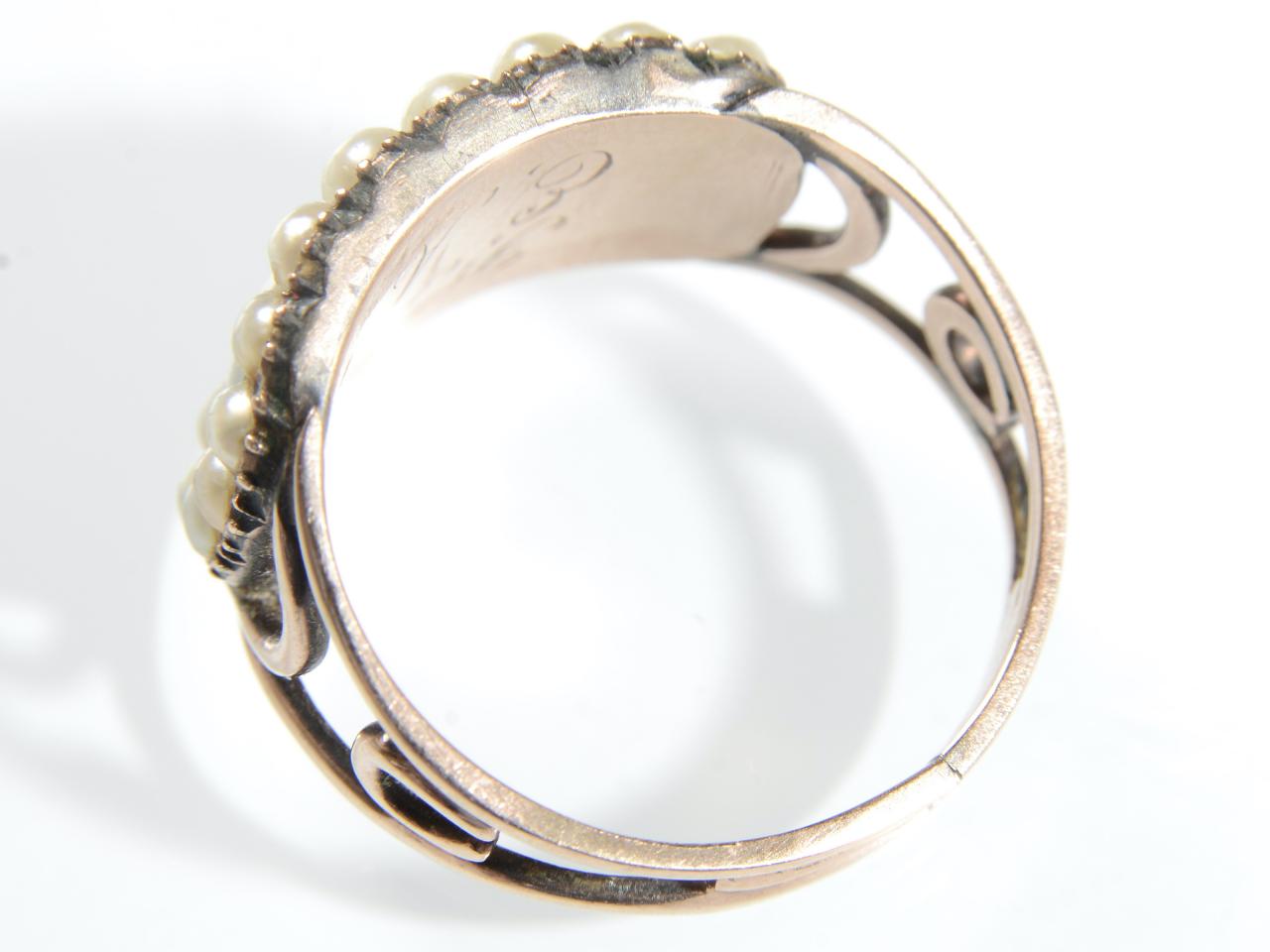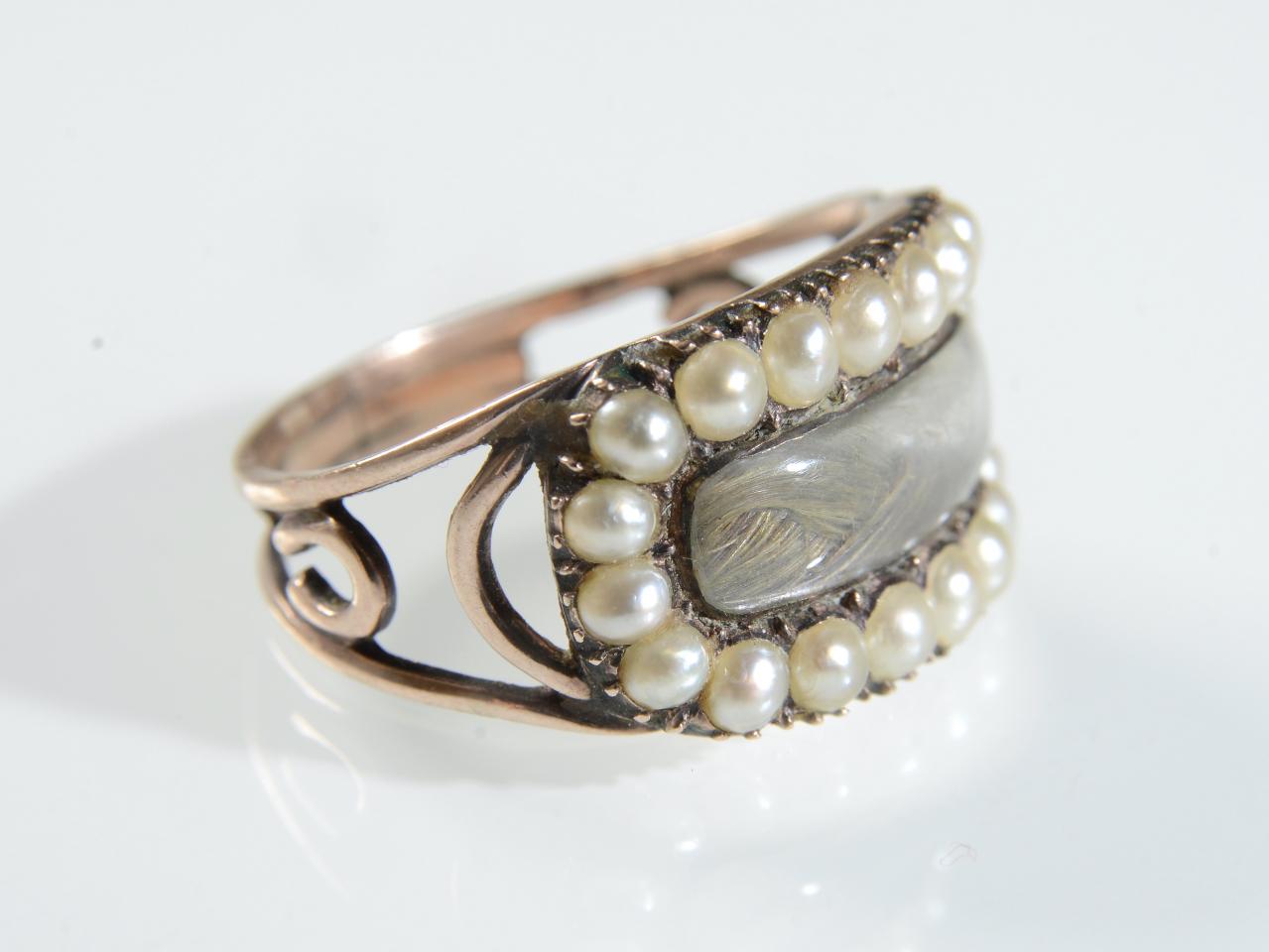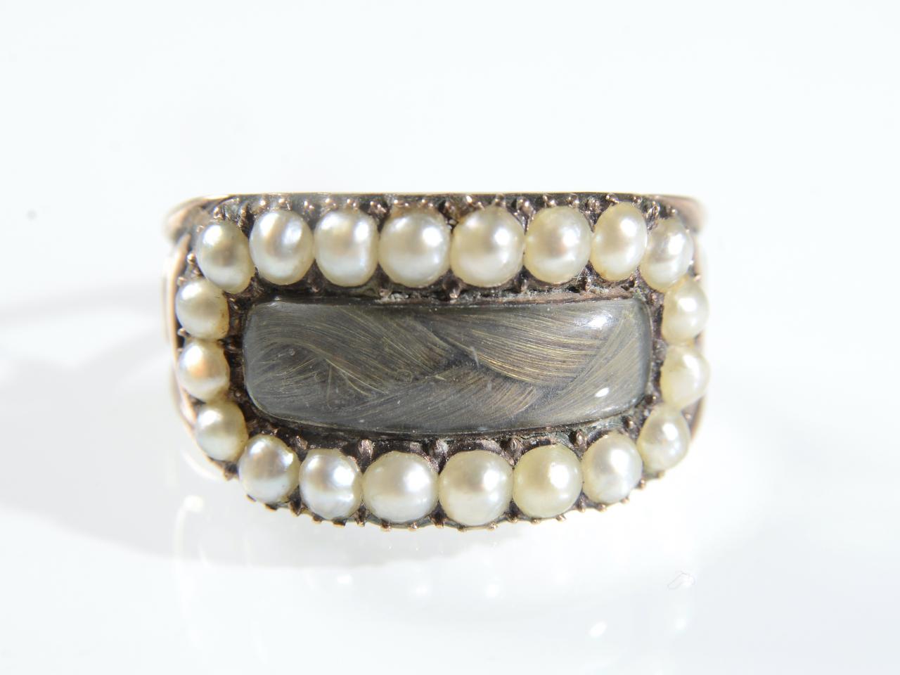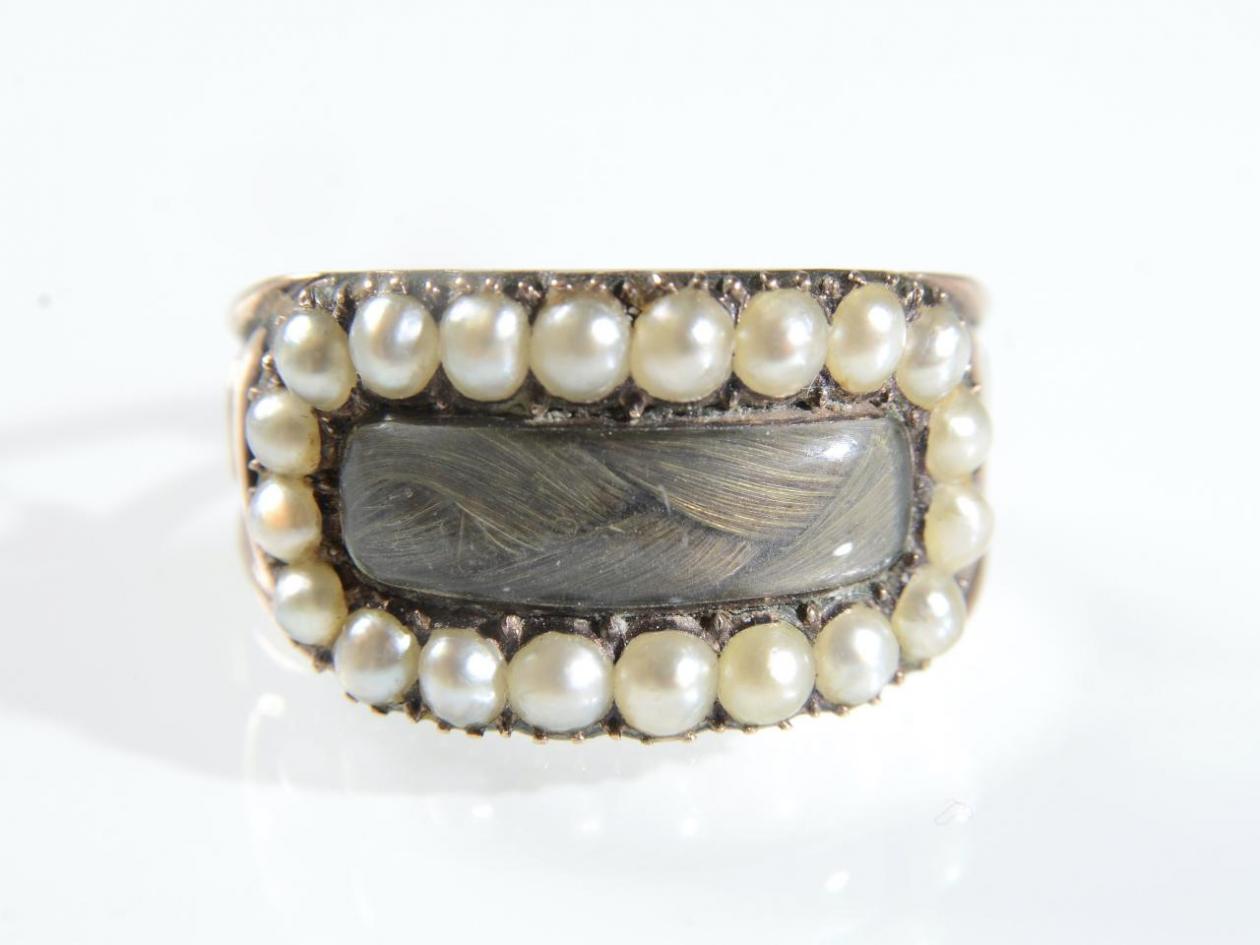 Late Georgian natural pearl and hair memorial ring in rose gold, centred with a braid of hair beneath a clear panel in a rubover setting, encircled by a frame of natural pearls in cut down settings, to a curved rectangular plaque engraved to the reverse with the initials 'F.A. E.A' in italic script, flanked by open trumpeting shoulders with wirework details which continue to a ribbed shank.