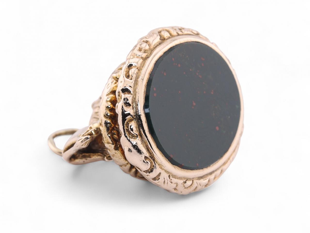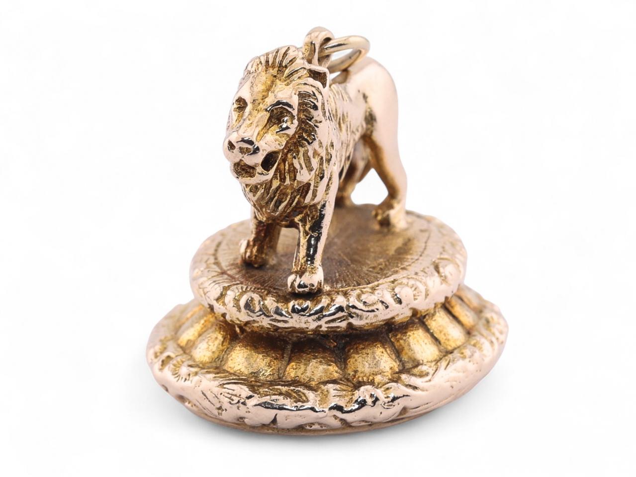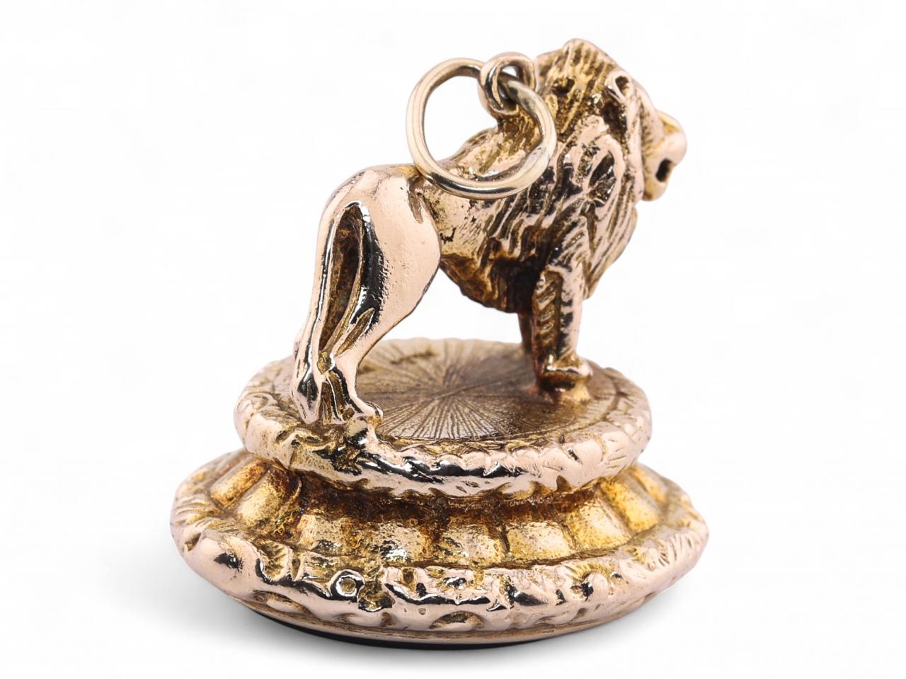 A vintage gold seal fob by the Albion Craft Company, London, dated 1971. The piece is crafted in 9kt gold and modelled as a lion standing atop a decorative circular base, set beneath with an oval bloodstone matrix. Fully hallmarked for London 1971. Total weight 23.5 grams.