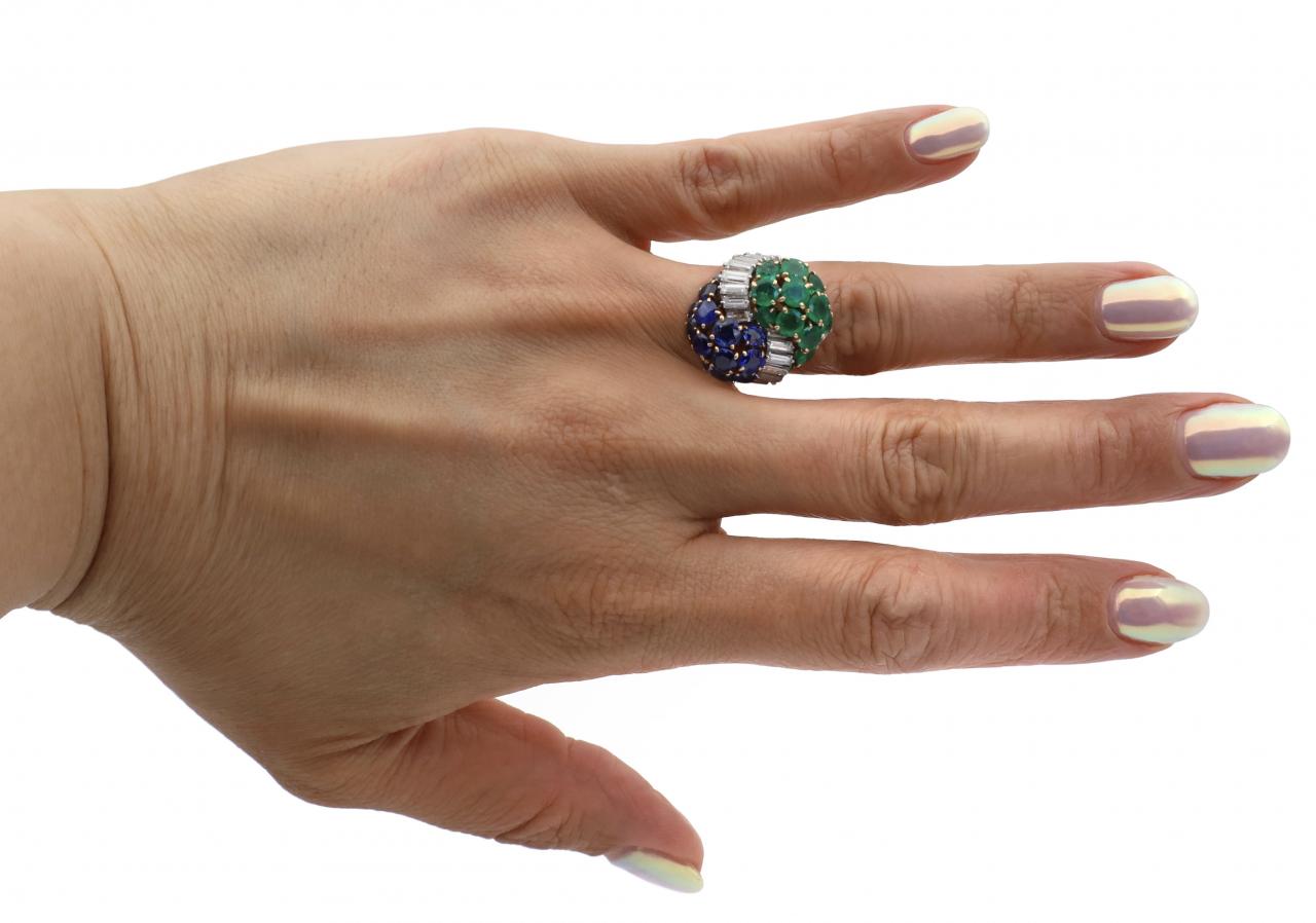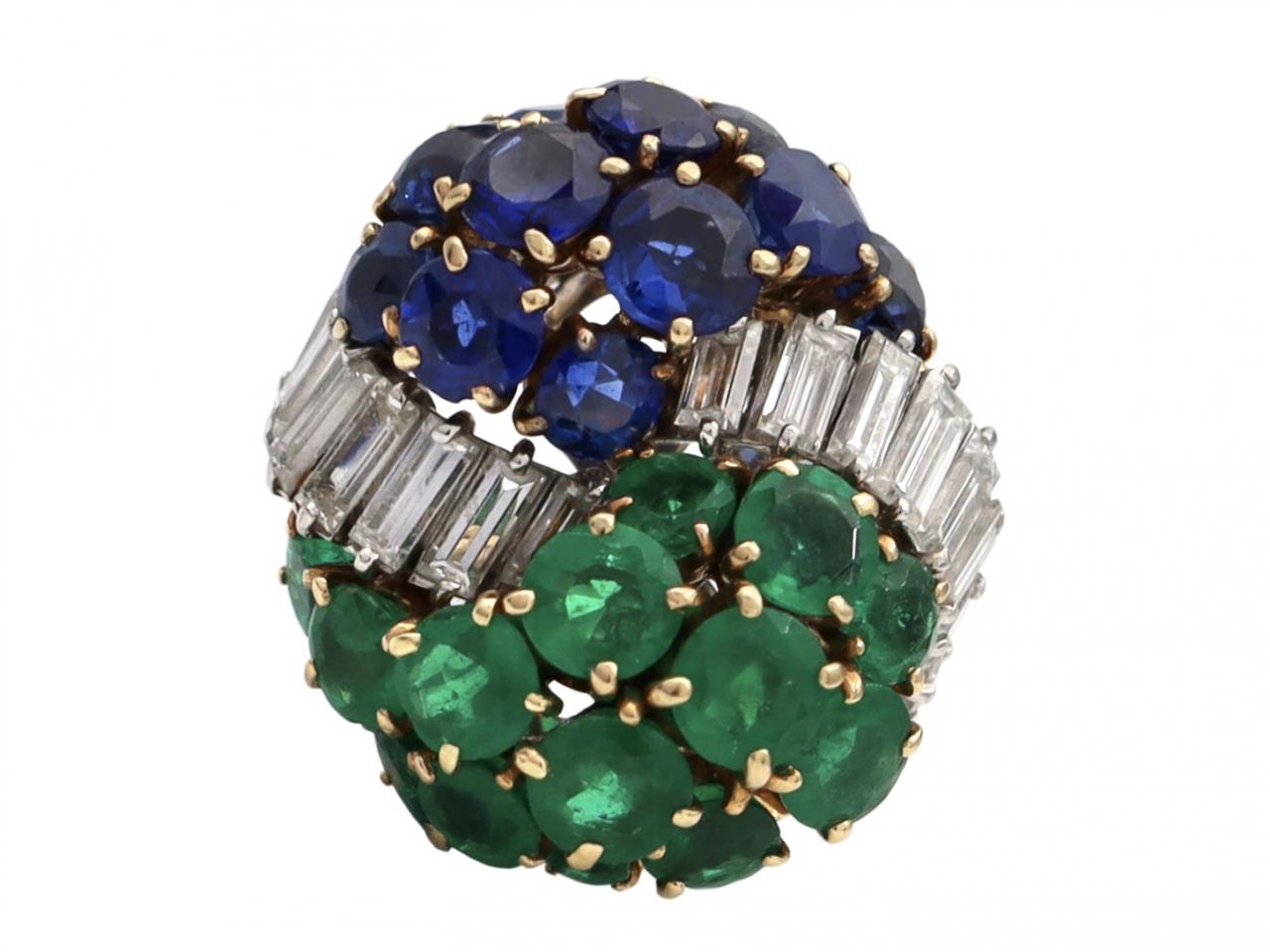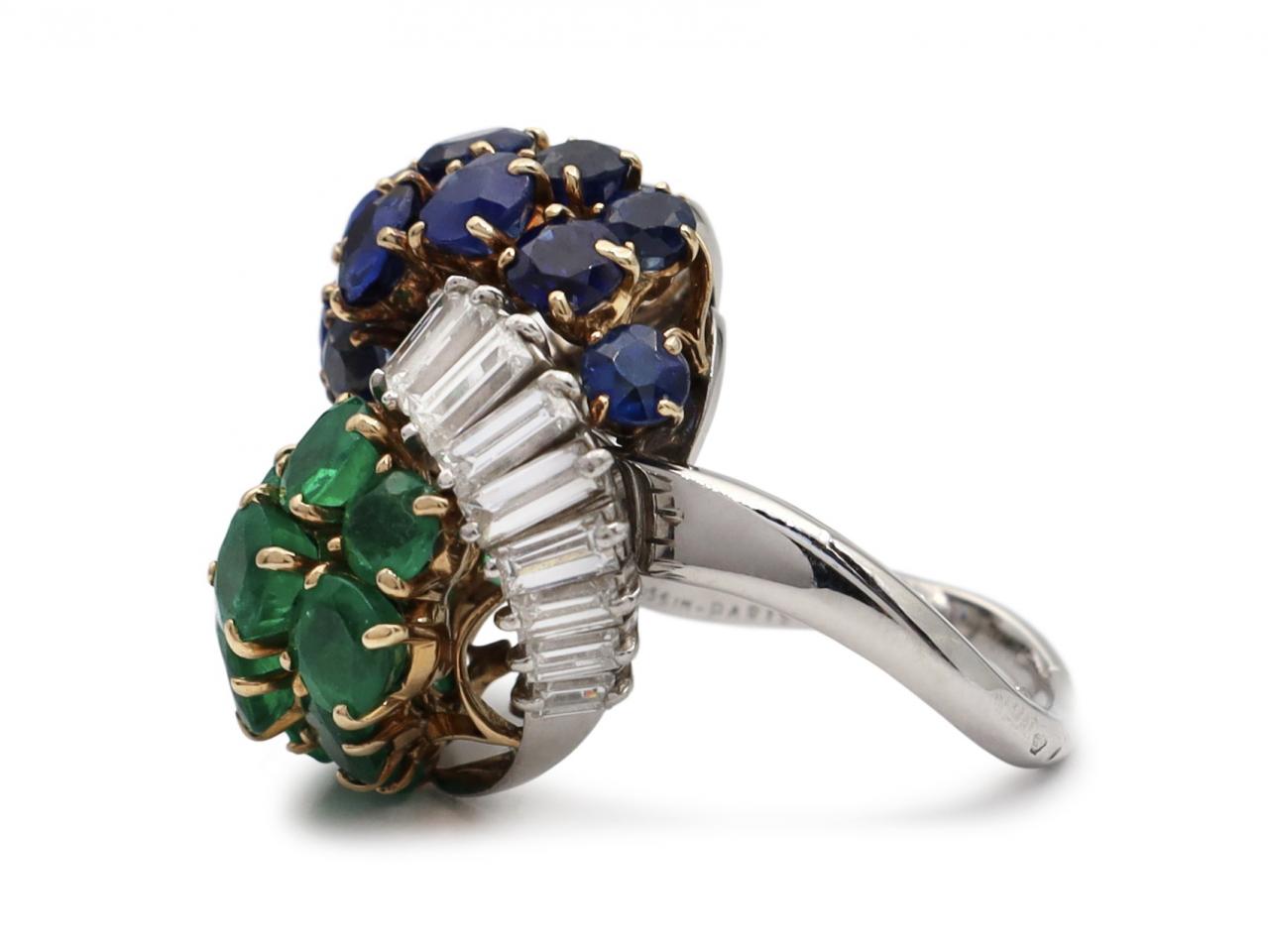 Mauboussin diamond, sapphire and emerald knot cluster ring in platinum, circa 1950. A swirling oval cluster consisting of two curving central panels of twenty rectangular baguette cut diamonds in claw settings, set to top with fourteen round mixed cut sapphires in raised four claw settings in yellow gold, set to bottom with fourteen round mixed cut emeralds in raised four claw settings in yellow gold, to a three-dimensional cluster design with intricately curving claws, structured open wirework gallery and met to either side with sweeping trumpeting shoulders which smooth and undulate to a flowing solid shank, fitted to the inner with two solid pips. Signed 'MAUBOUSSIN PARIS'. Numbered '16268'.