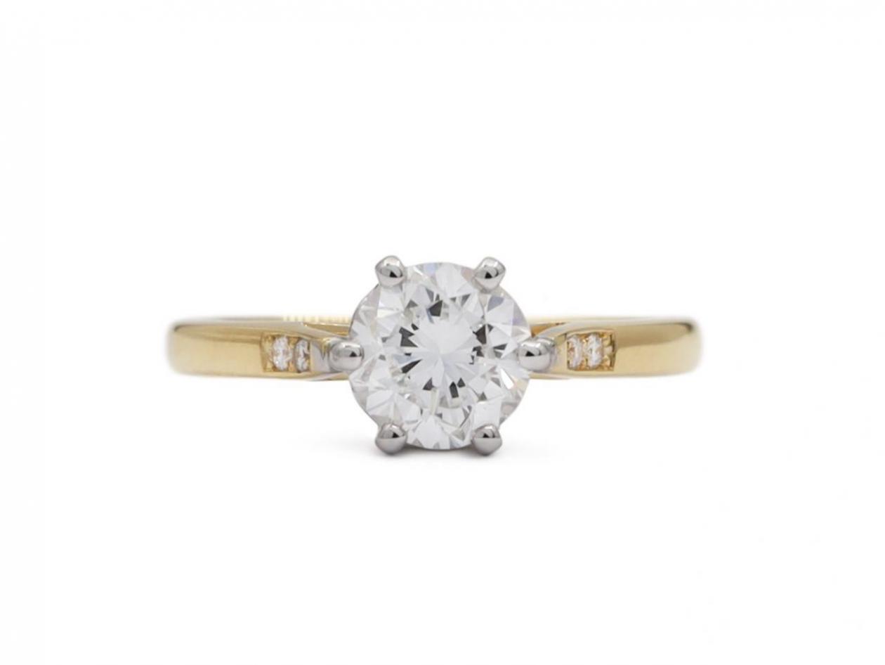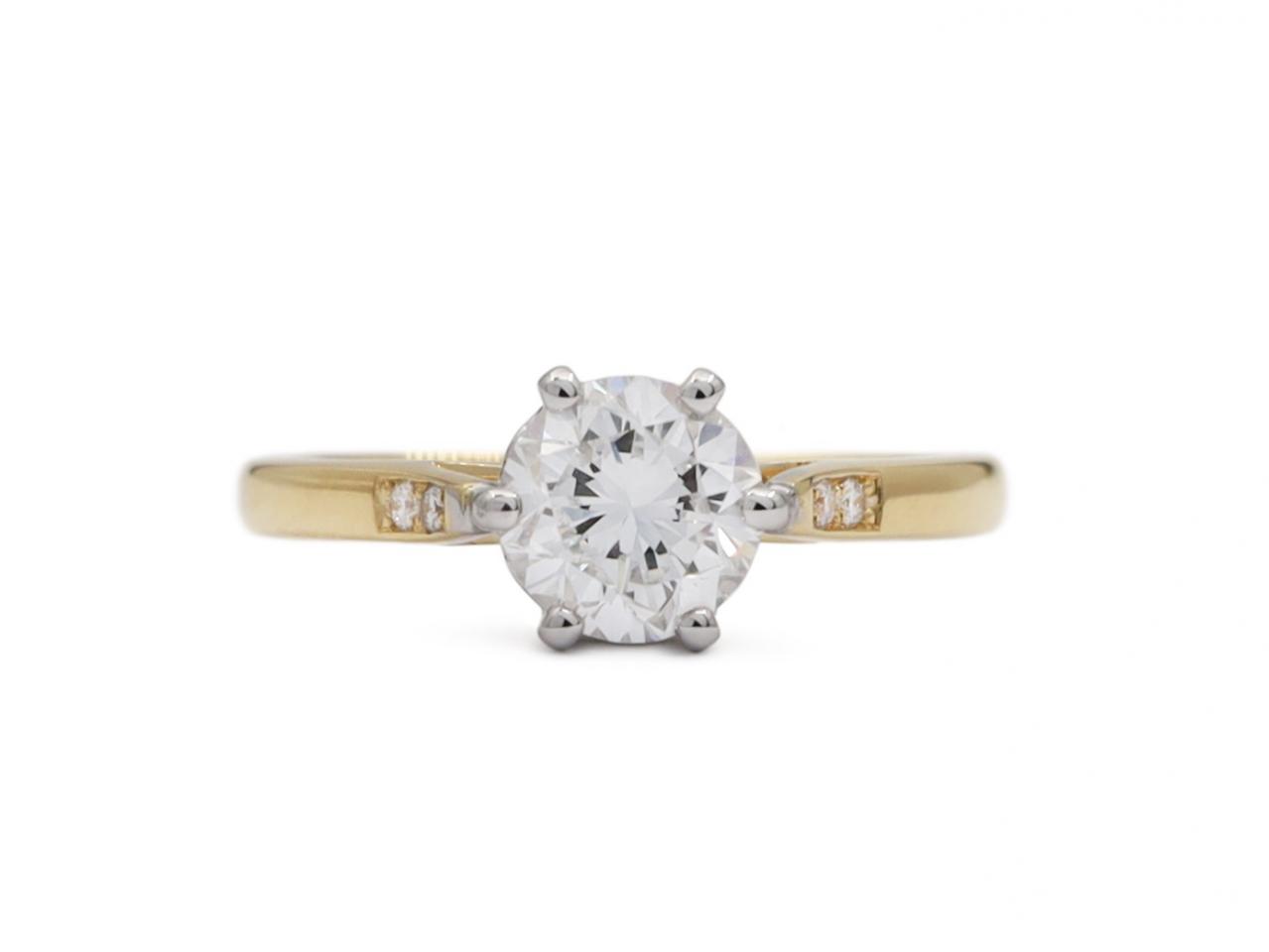 Modern 1.02ct round brilliant cut diamond solitaire engagement ring in 18kt yellow gold. Set with a 1.02ct round brilliant cut diamond, E colour, VS2 clarity in a raised six claw setting, to a flanked solitaire design with decoratively pierced collet, curving claws, raised inwardly tapering diamond set shoulders which terminate to a solid shank. Marked 18kt gold. Accompanied by HRD Antwerp certificate.